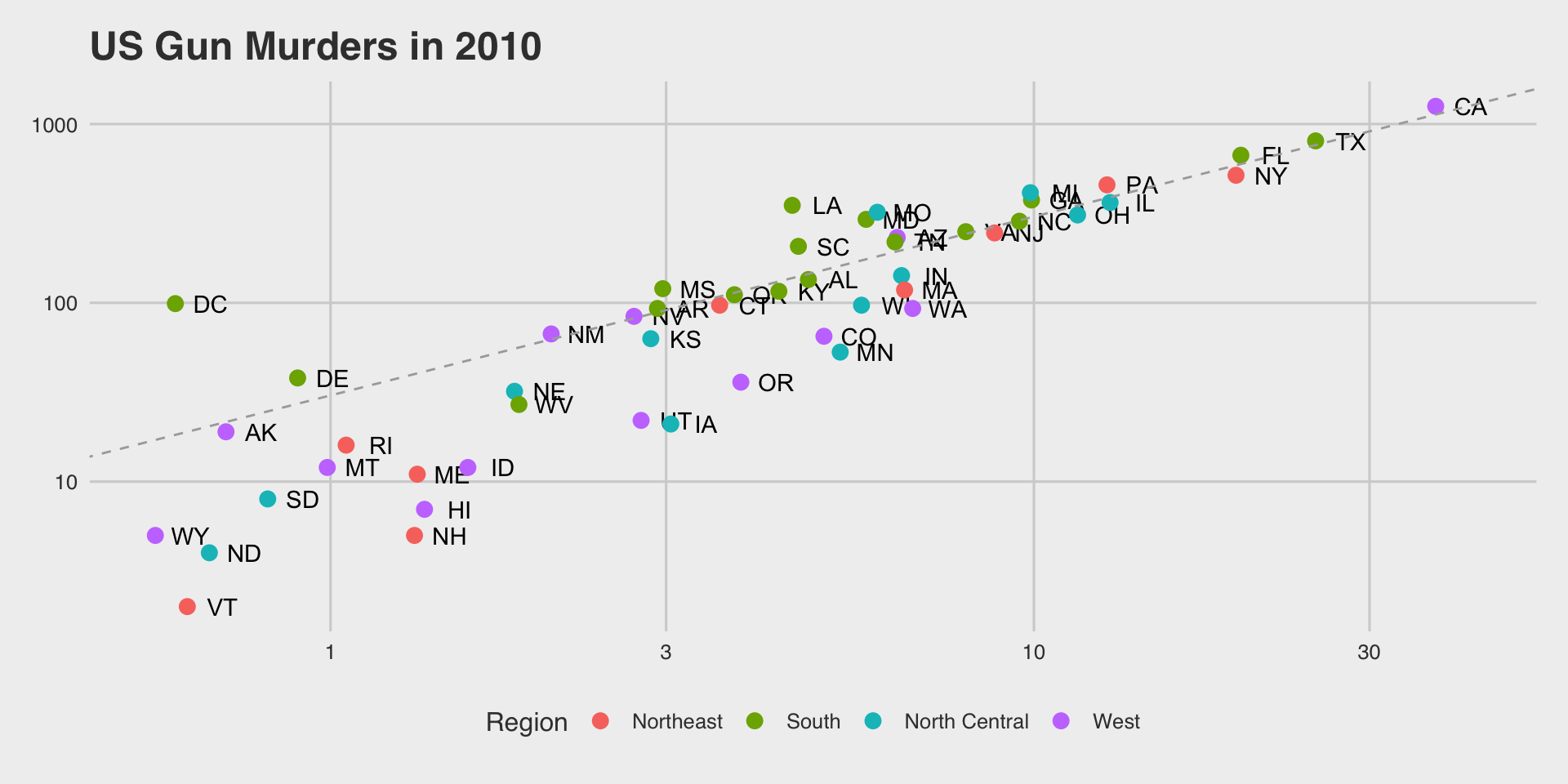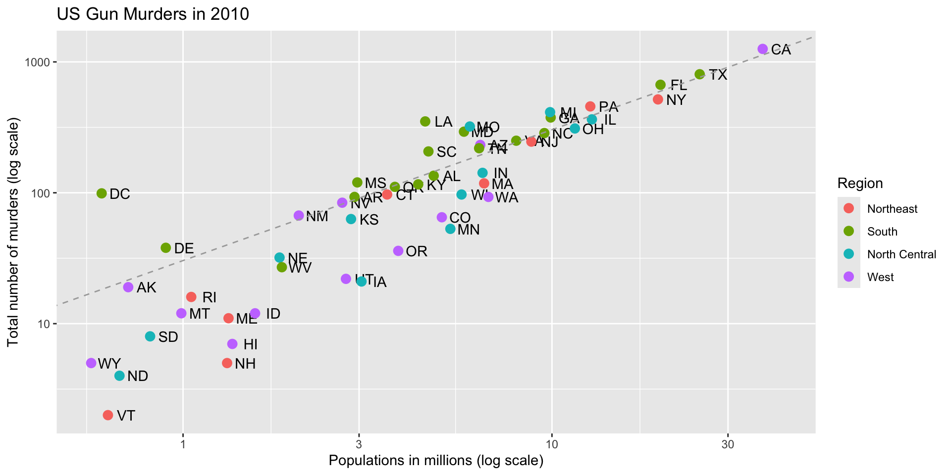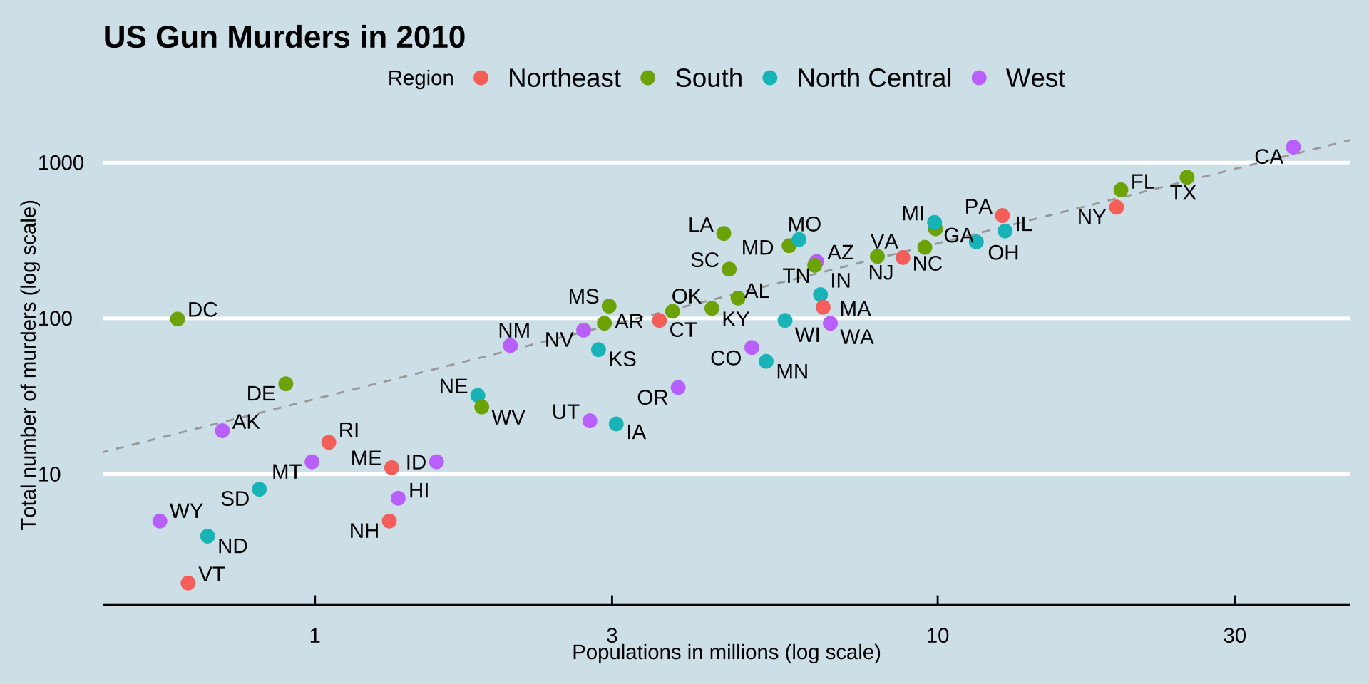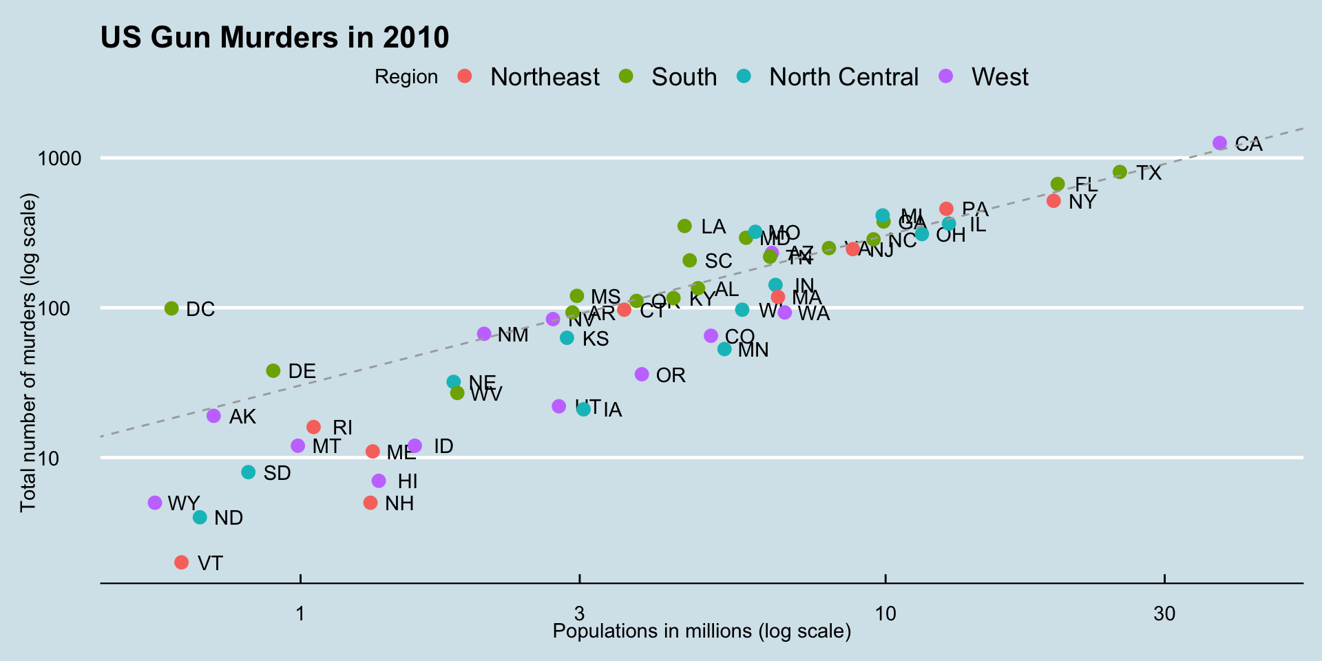 geom_abline(intercept = log10(r), lty = 2, color = "darkgrey")p and add layers.p <- murders |> ggplot(aes(population/10^6, total, label = abb)) +