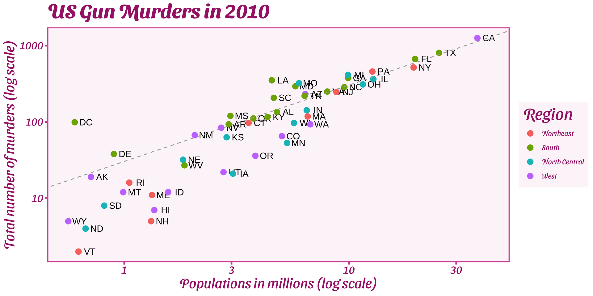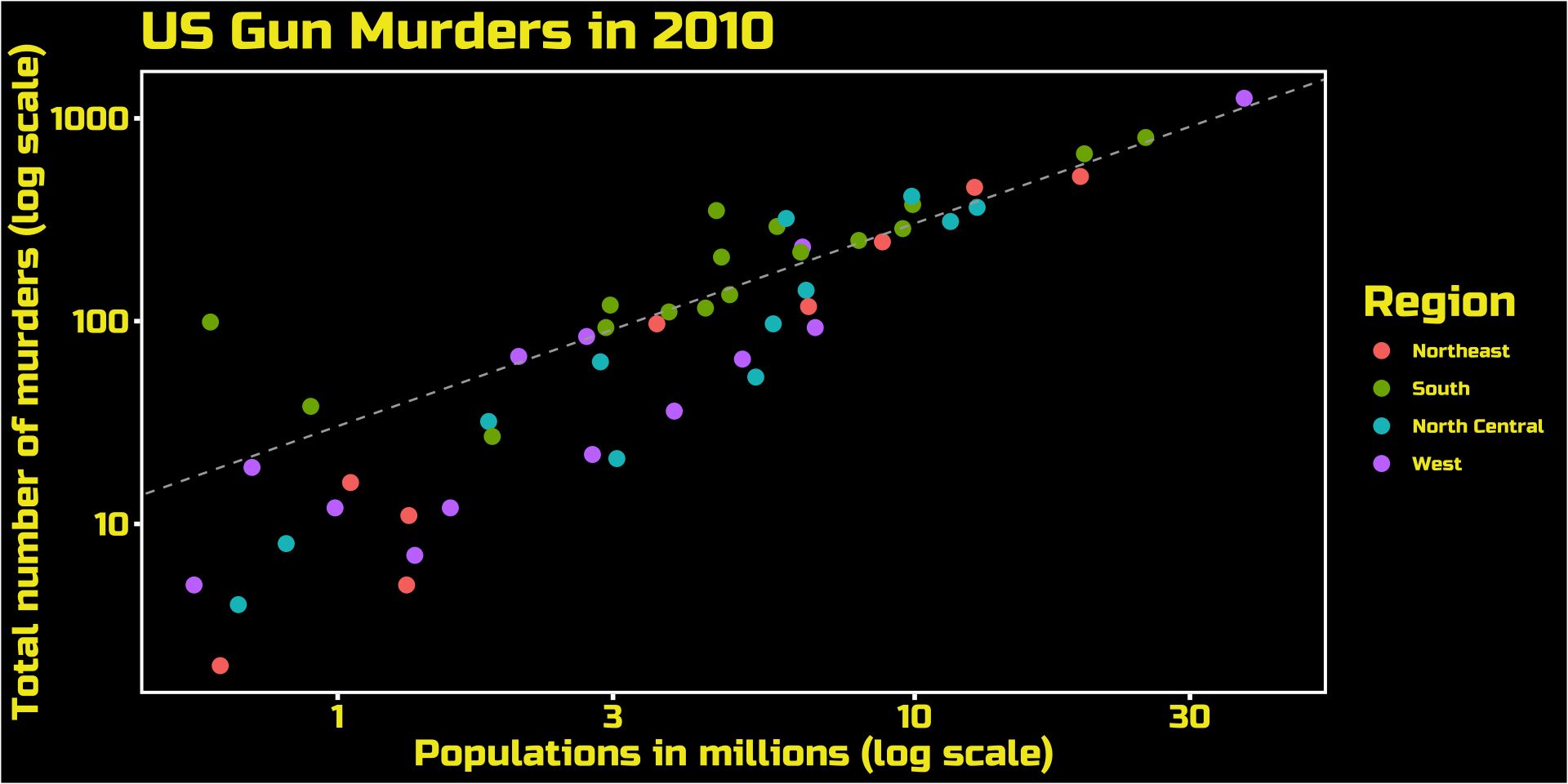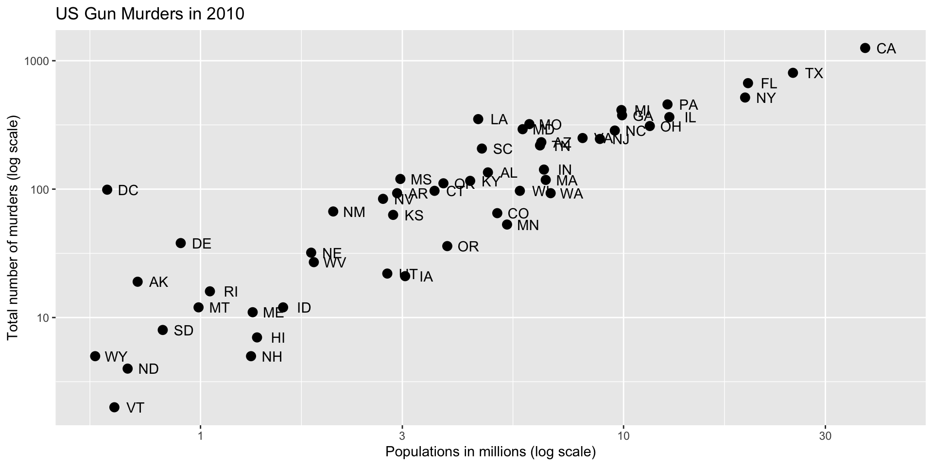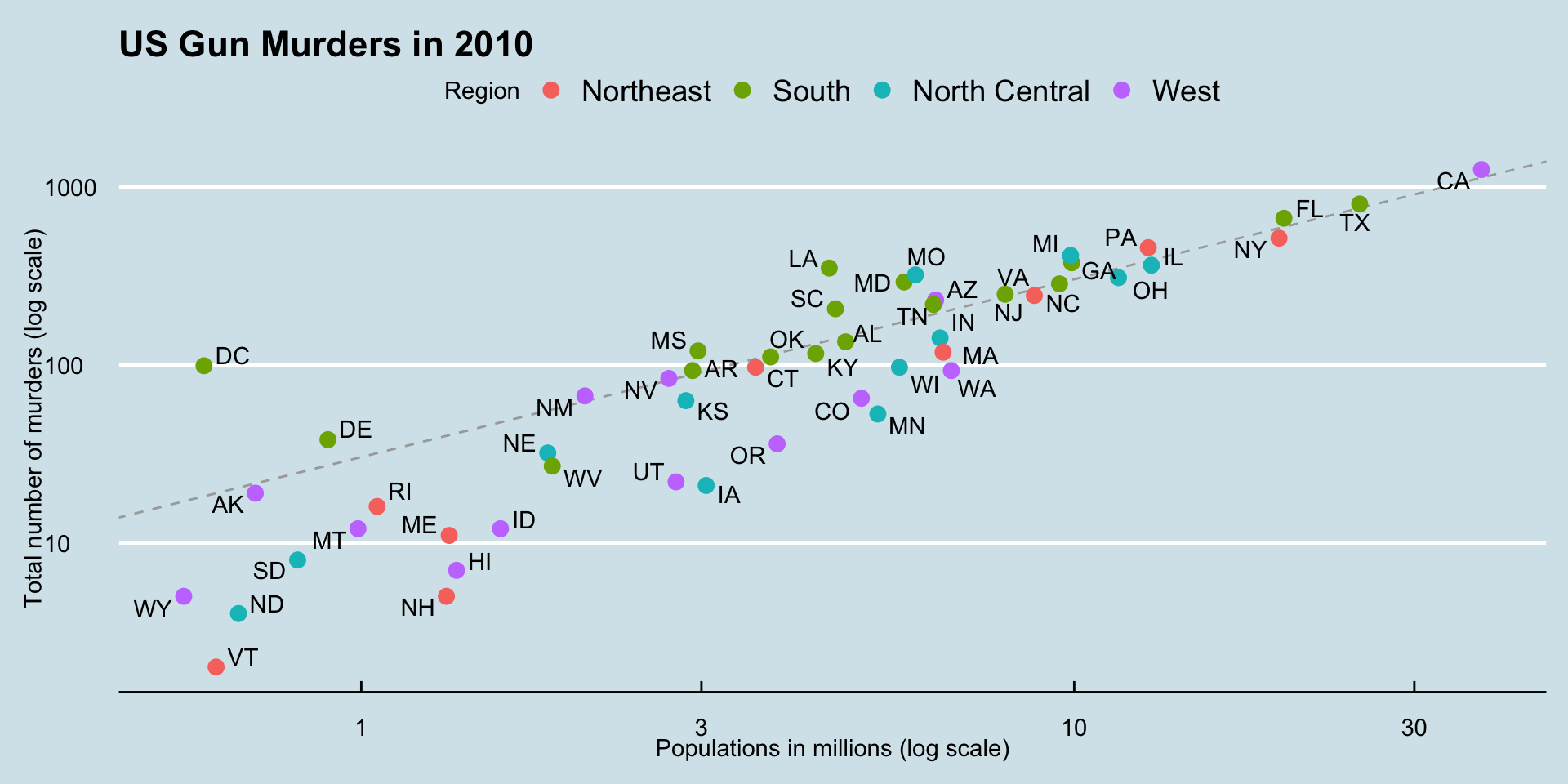 geom_abline(intercept = log10(r), lty = 2, color = "darkgrey")p and add layers.p <- murders |> ggplot(aes(population/10^6, total, label = abb)) +