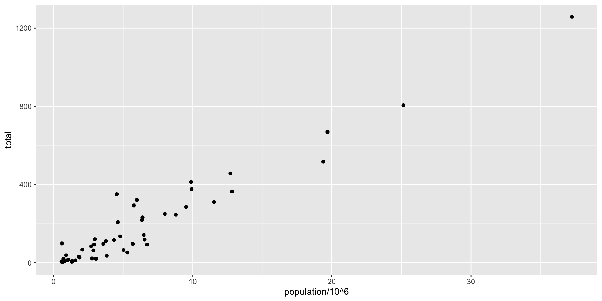 murders |> ggplot(aes(population/10^6, total, label = abb)) +