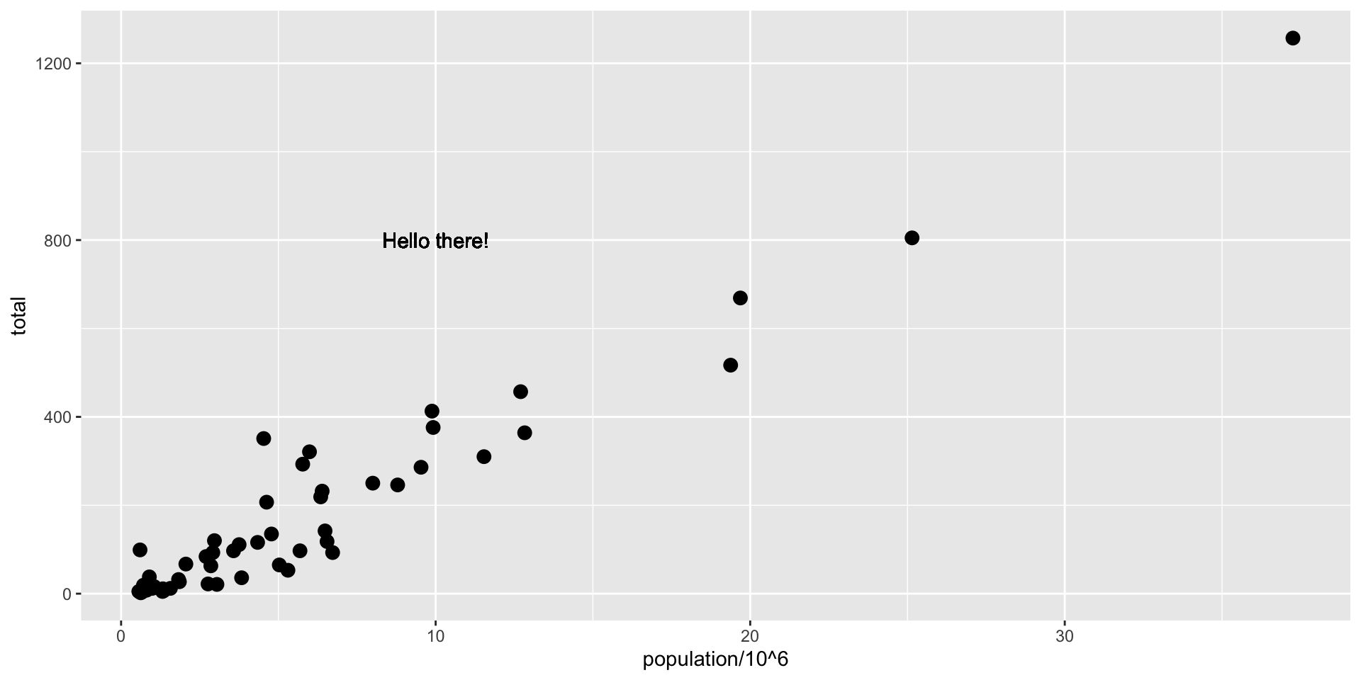 p earlier, we can add a layer like this:x= and y =.geom_text:aes note that this call:is fine, whereas this call:
