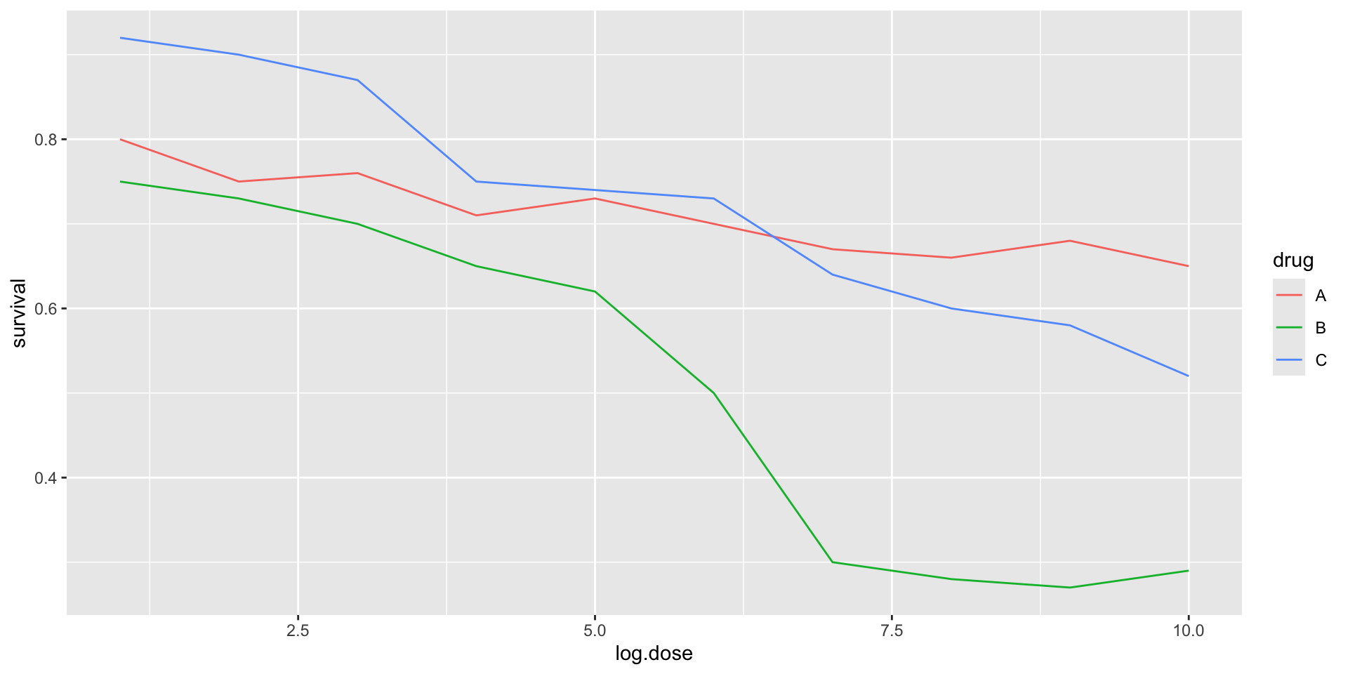 The figure below, taken from the scientific literature, shows three variables: dose, drug type and survival: