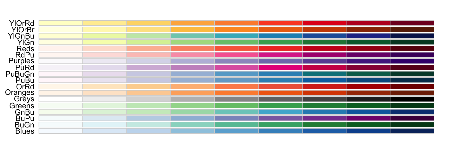 Sequential colors are suited for data that goes from high to low. High values are clearly distinguished from low values. Here are some examples offered by the package RColorBrewer: