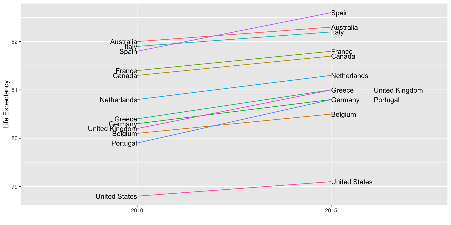 Slope charts adds angle as a visual cue, useful when comparing two groups and each element across two variables, such as years.
