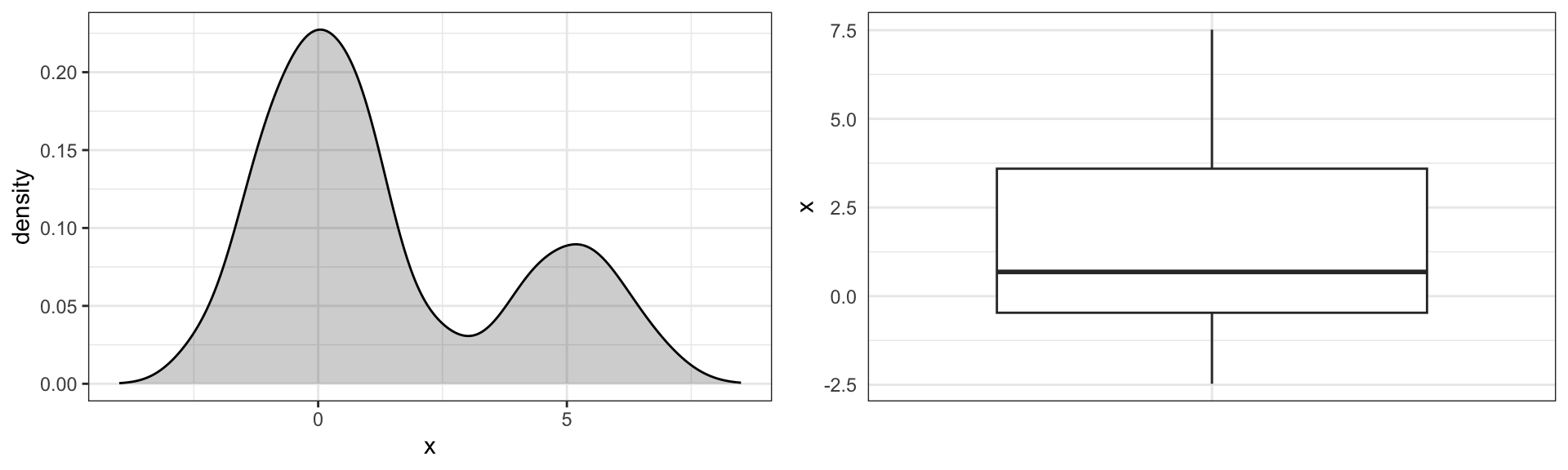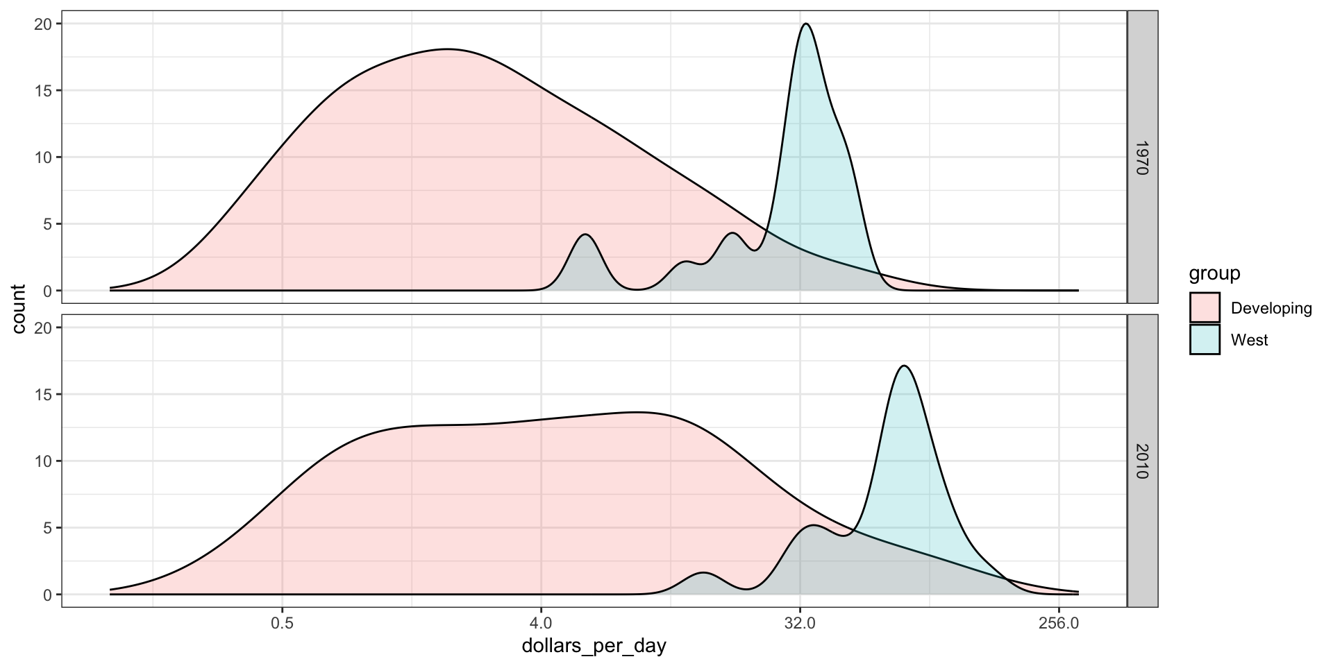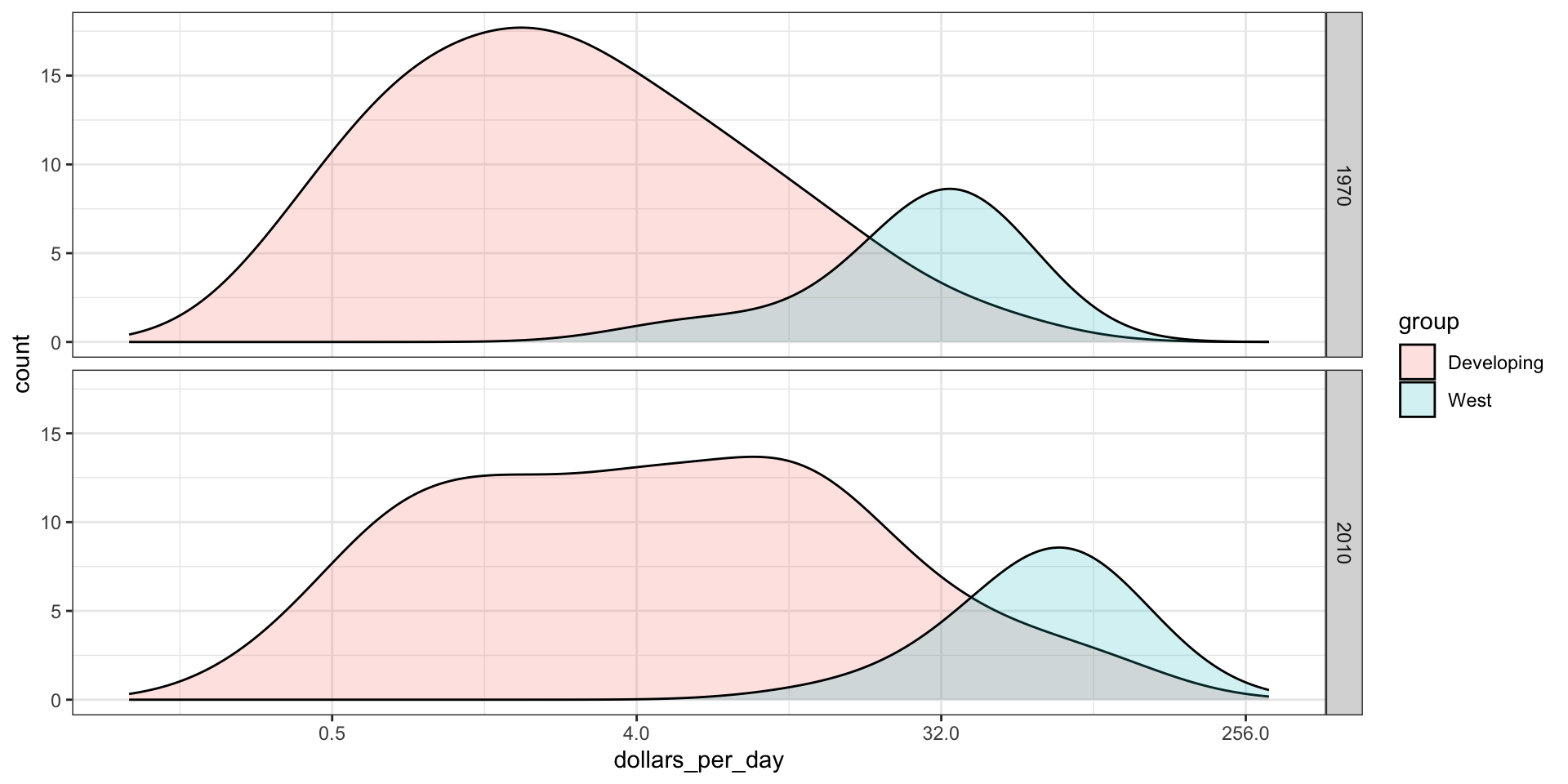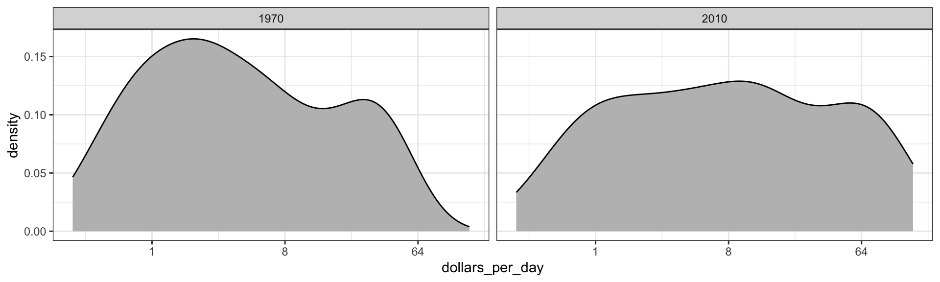 gapminder |>filter(year %in% years & country %in% country_list) |>ggplot(aes(dollars_per_day)) +geom_density(fill ="grey") +scale_x_continuous(trans ="log2") +facet_grid(. ~ year)