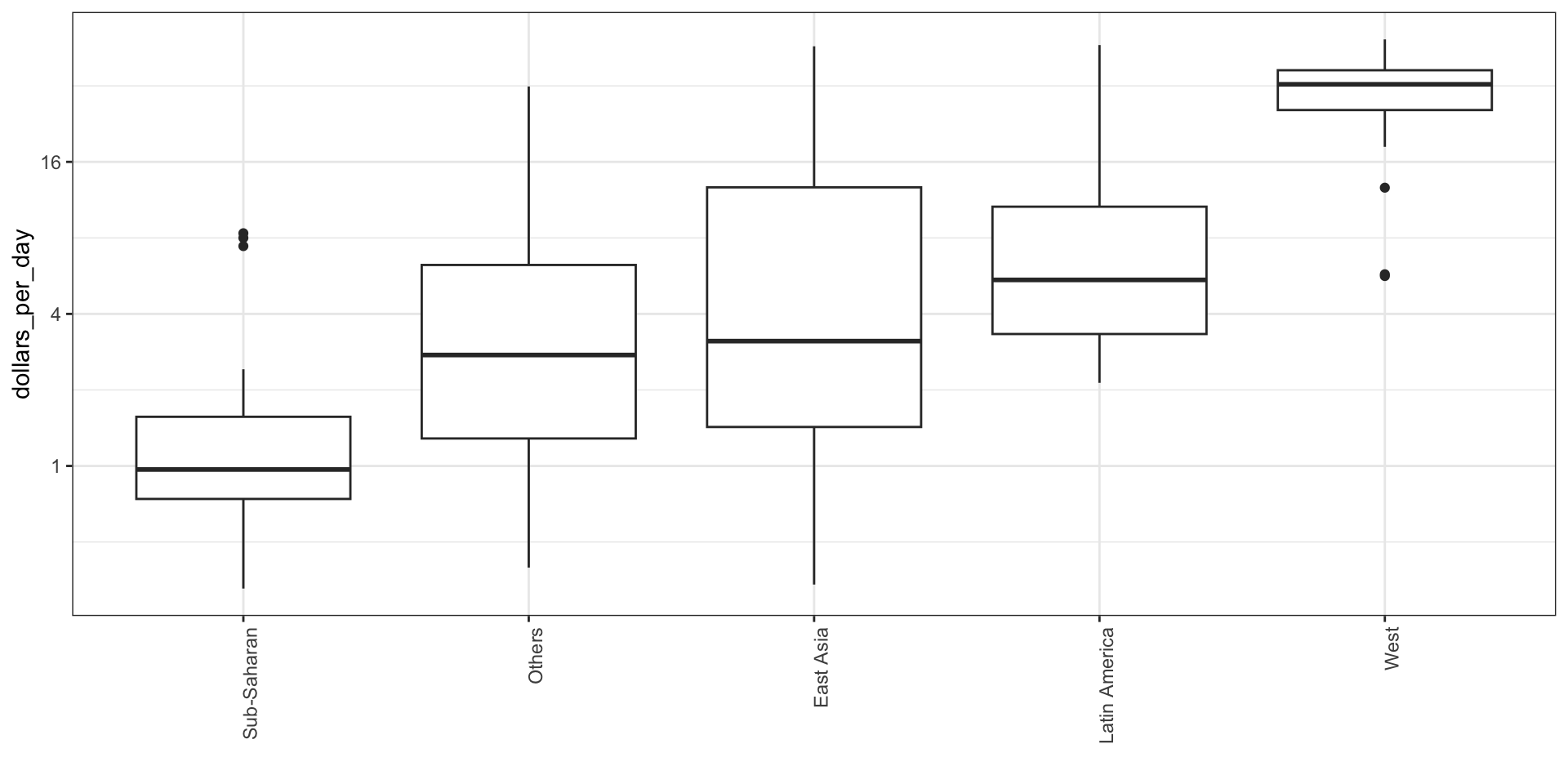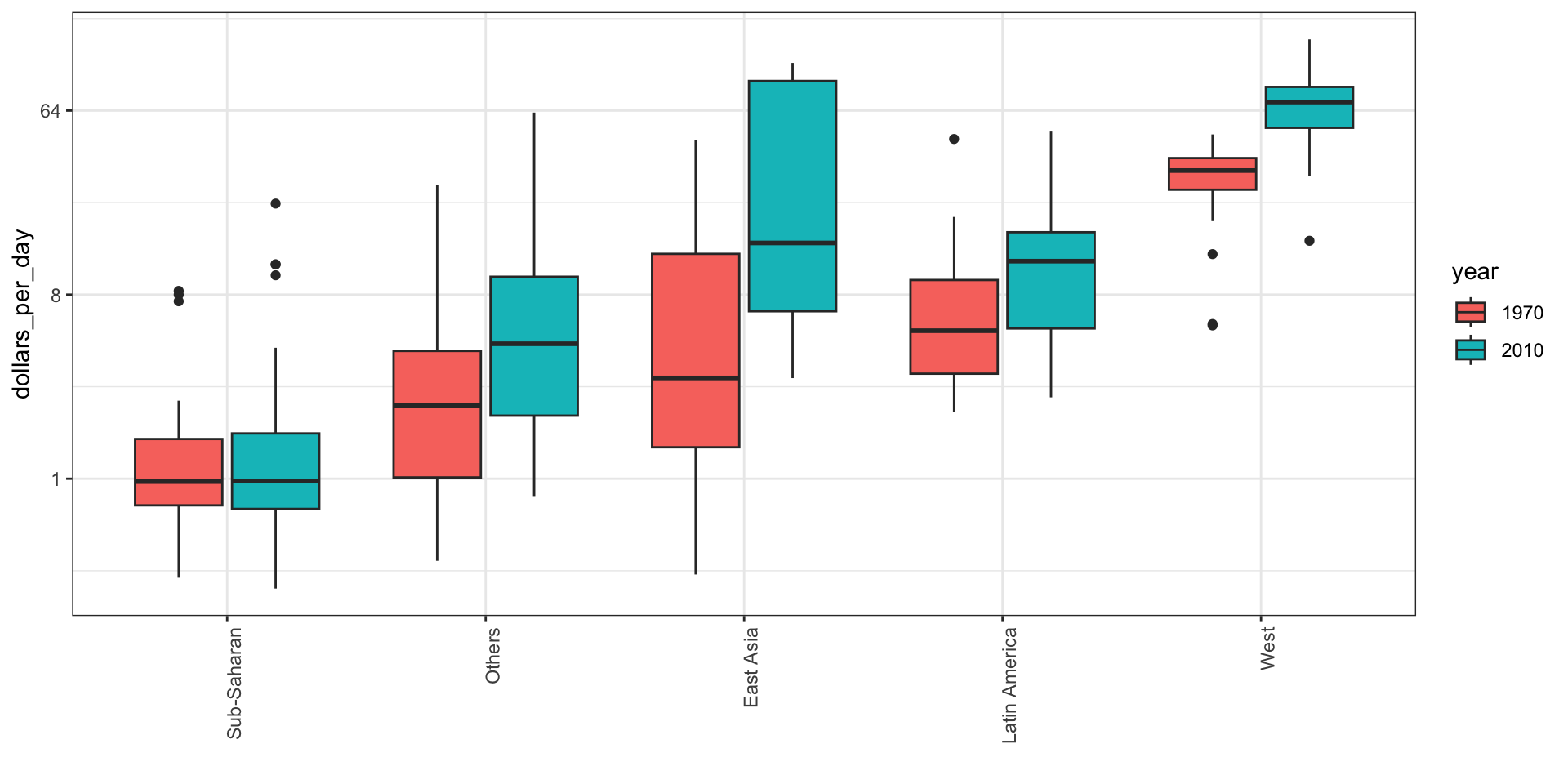 gapminder |>filter(year %in% years & country %in% country_list) |>mutate(group =reorder(group, dollars_per_day, FUN = median),year =factor(year)) |>ggplot(aes(group, dollars_per_day, fill = year)) +geom_boxplot() +theme(axis.text.x =element_text(angle =90, hjust =1)) +scale_y_continuous(trans ="log2") +xlab("")