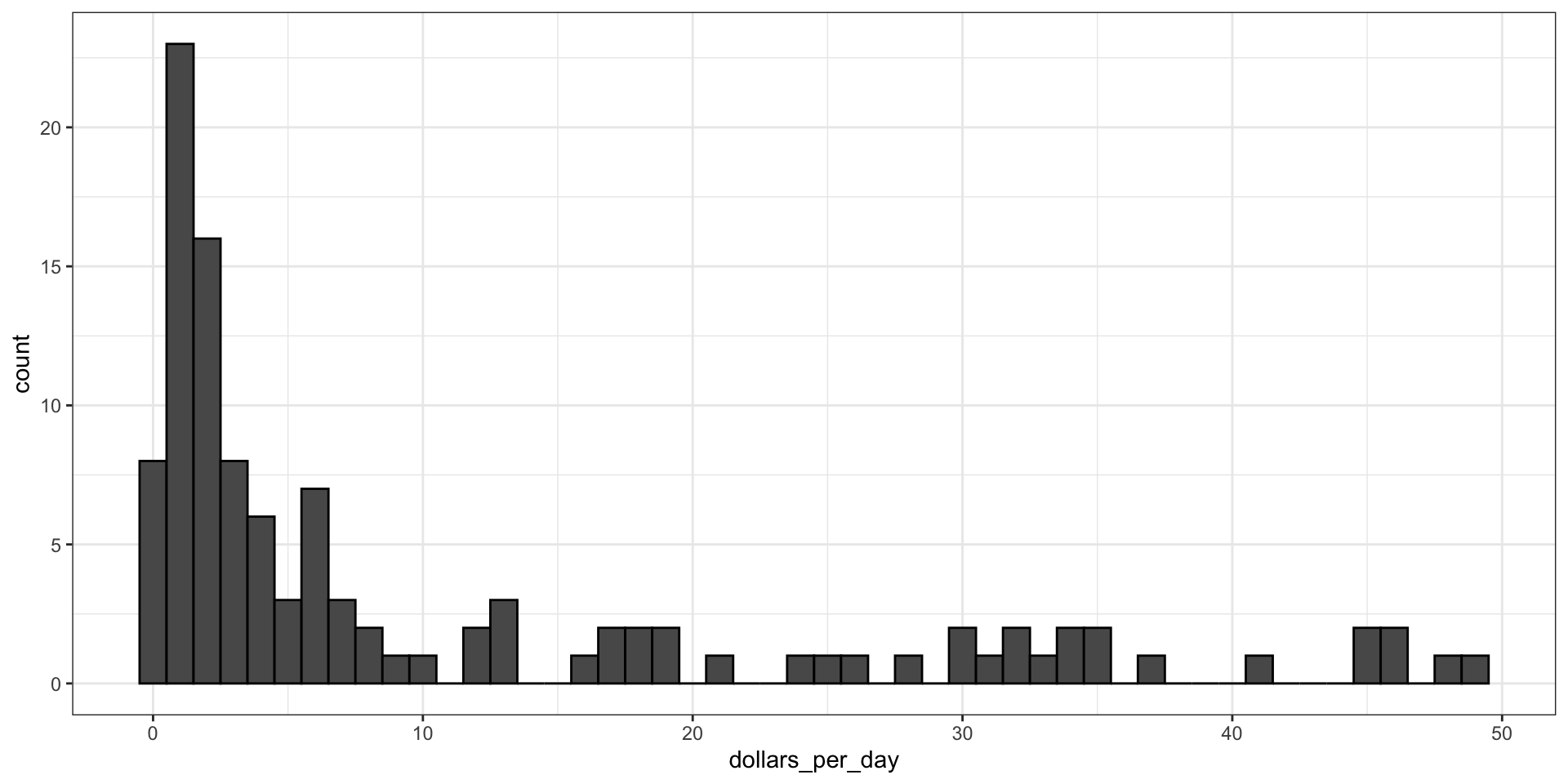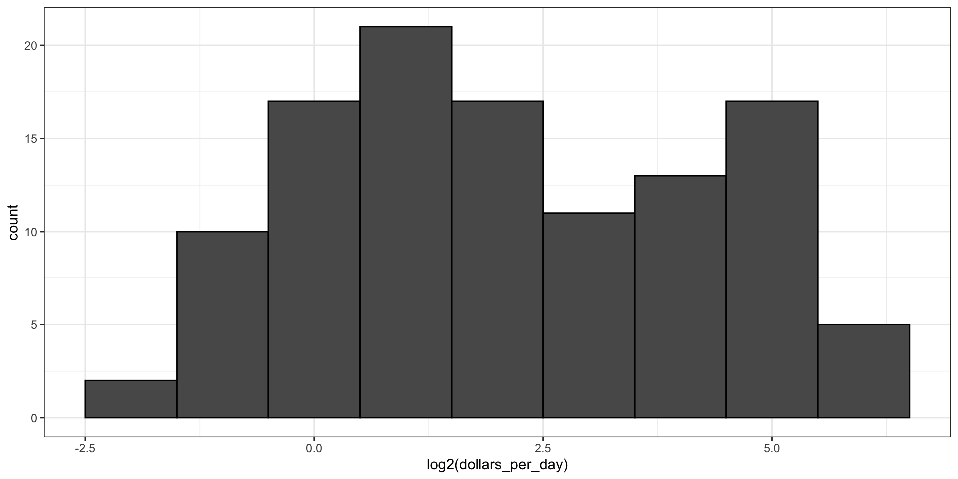 gapminder |>filter(year == past_year &!is.na(gdp)) |>ggplot(aes(log2(dollars_per_day))) +geom_histogram(binwidth =1, color ="black")