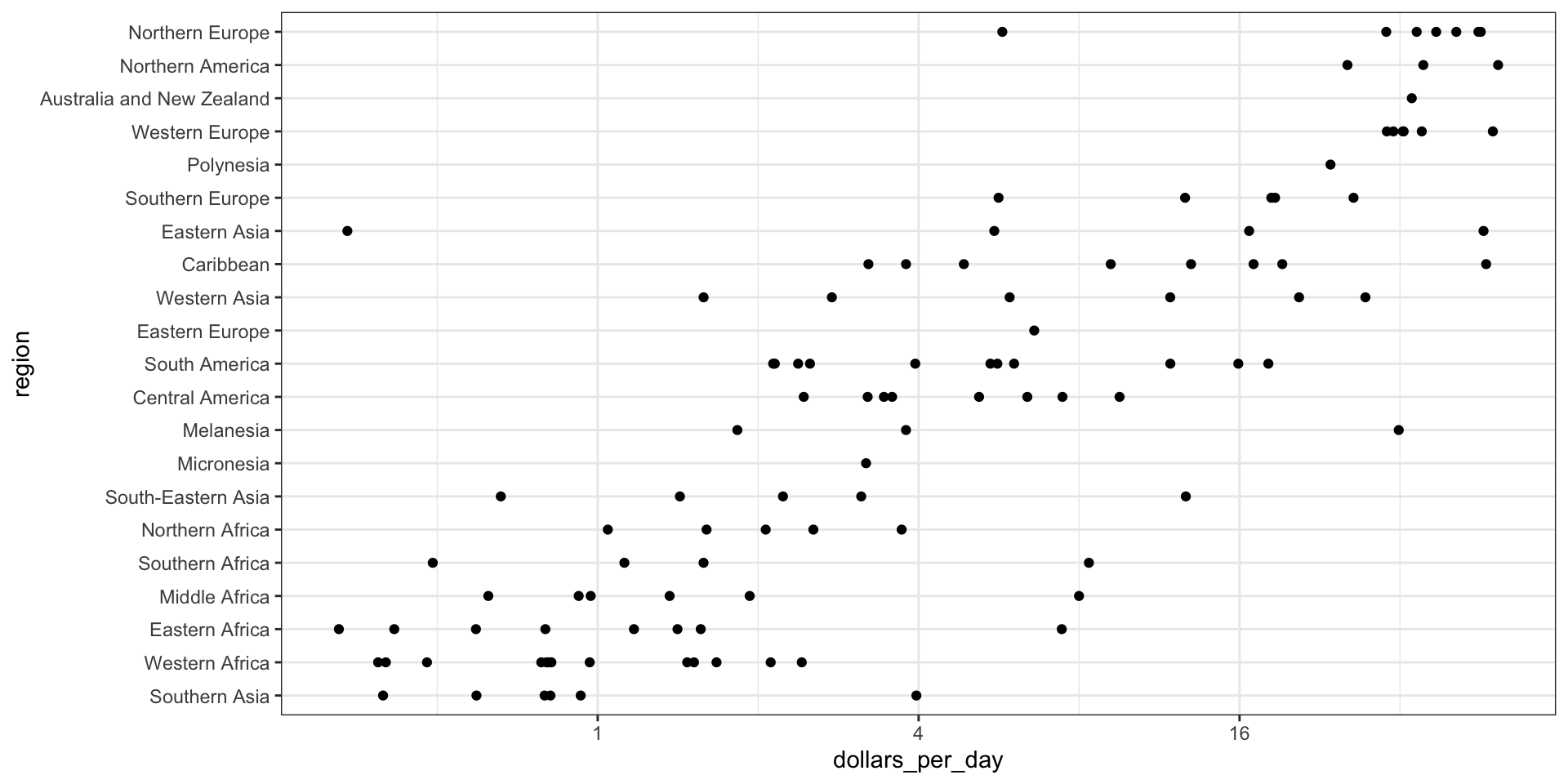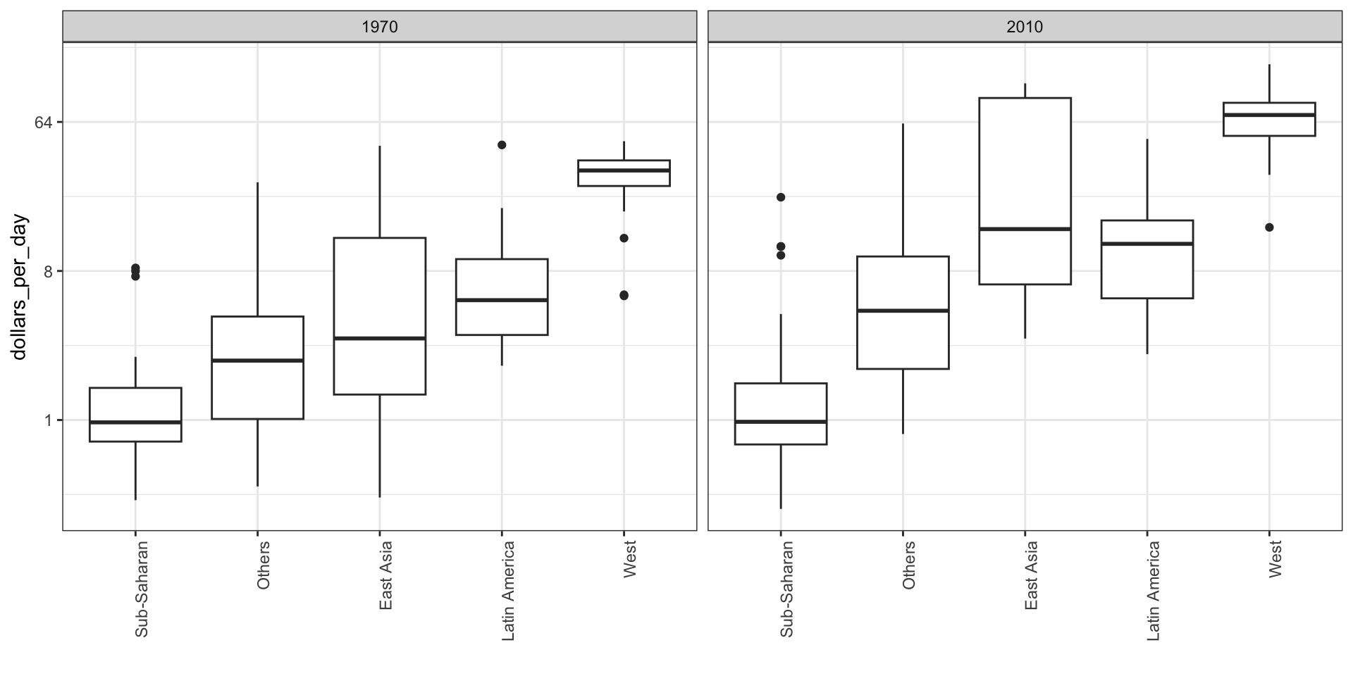 gapminder |>filter(year %in% years & country %in% country_list) |>mutate(group =reorder(group, dollars_per_day, FUN = median)) |>ggplot(aes(group, dollars_per_day)) +geom_boxplot() +theme(axis.text.x =element_text(angle =90, hjust =1)) +scale_y_continuous(trans ="log2") +xlab("") +facet_grid(. ~ year)
