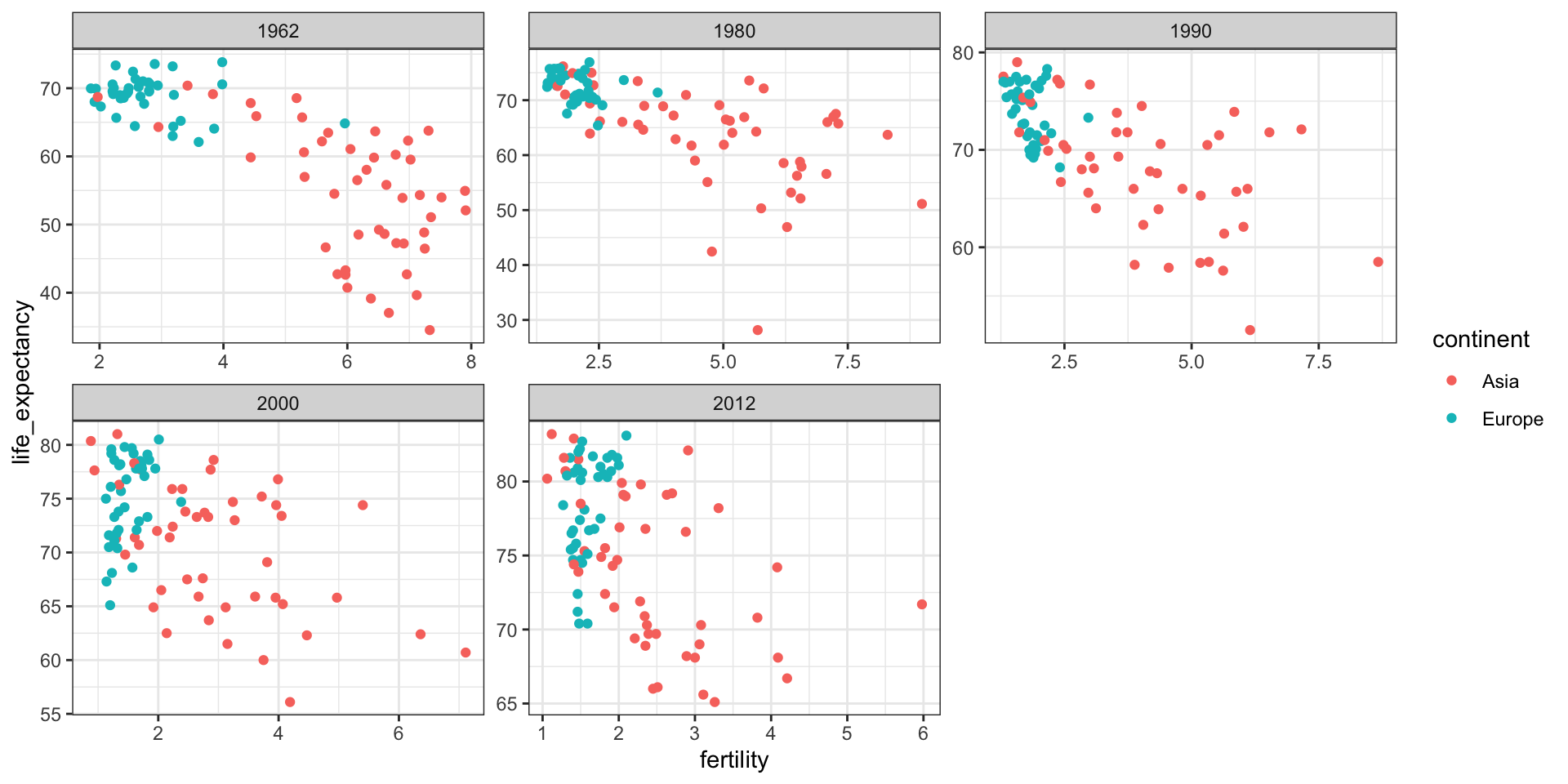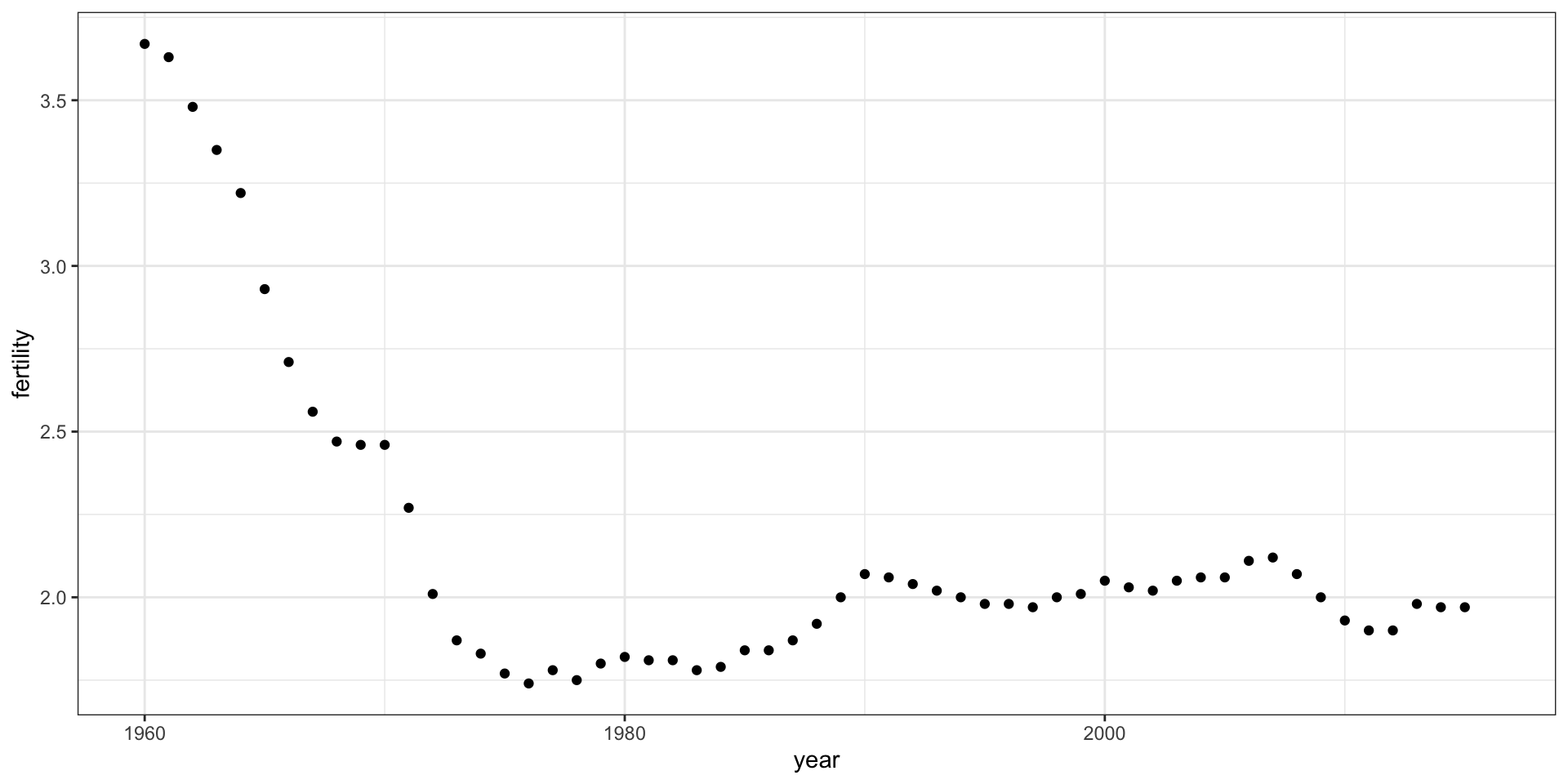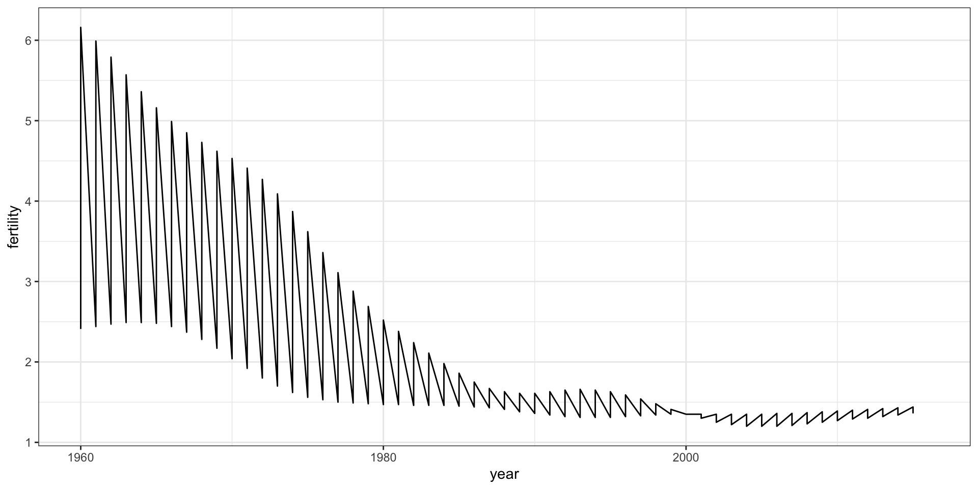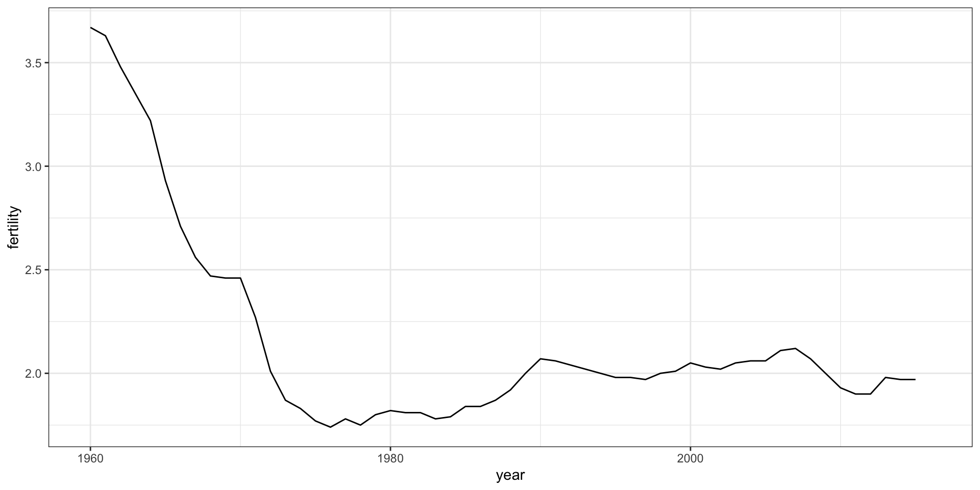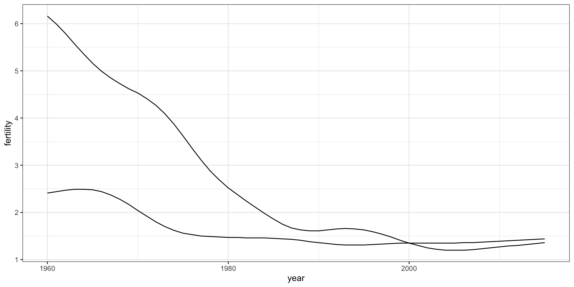 countries <-c("South Korea", "Germany") gapminder |>filter(country %in% countries) |>ggplot(aes(year,fertility)) +geom_line()
