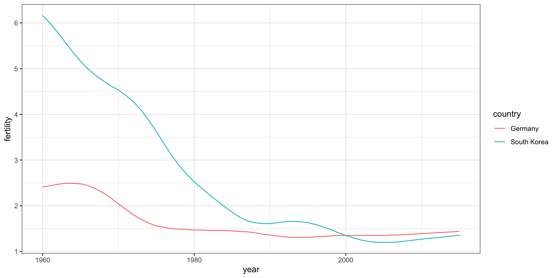 countries <-c("South Korea","Germany") gapminder |>filter(country %in% countries &!is.na(fertility)) |>ggplot(aes(year,fertility, col = country)) +geom_line()
