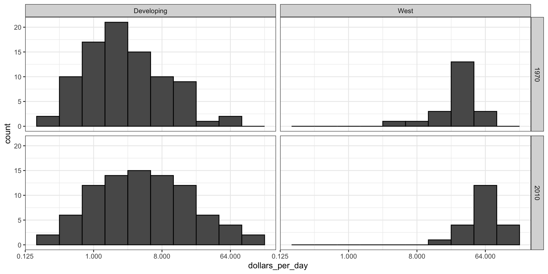 gapminder |>filter(year %in% years & country %in% country_list) |>mutate(west =ifelse(group =="West", "West", "Developing")) |>ggplot(aes(dollars_per_day)) +geom_histogram(binwidth =1, color ="black") +scale_x_continuous(trans ="log2") +facet_grid(year ~ west)