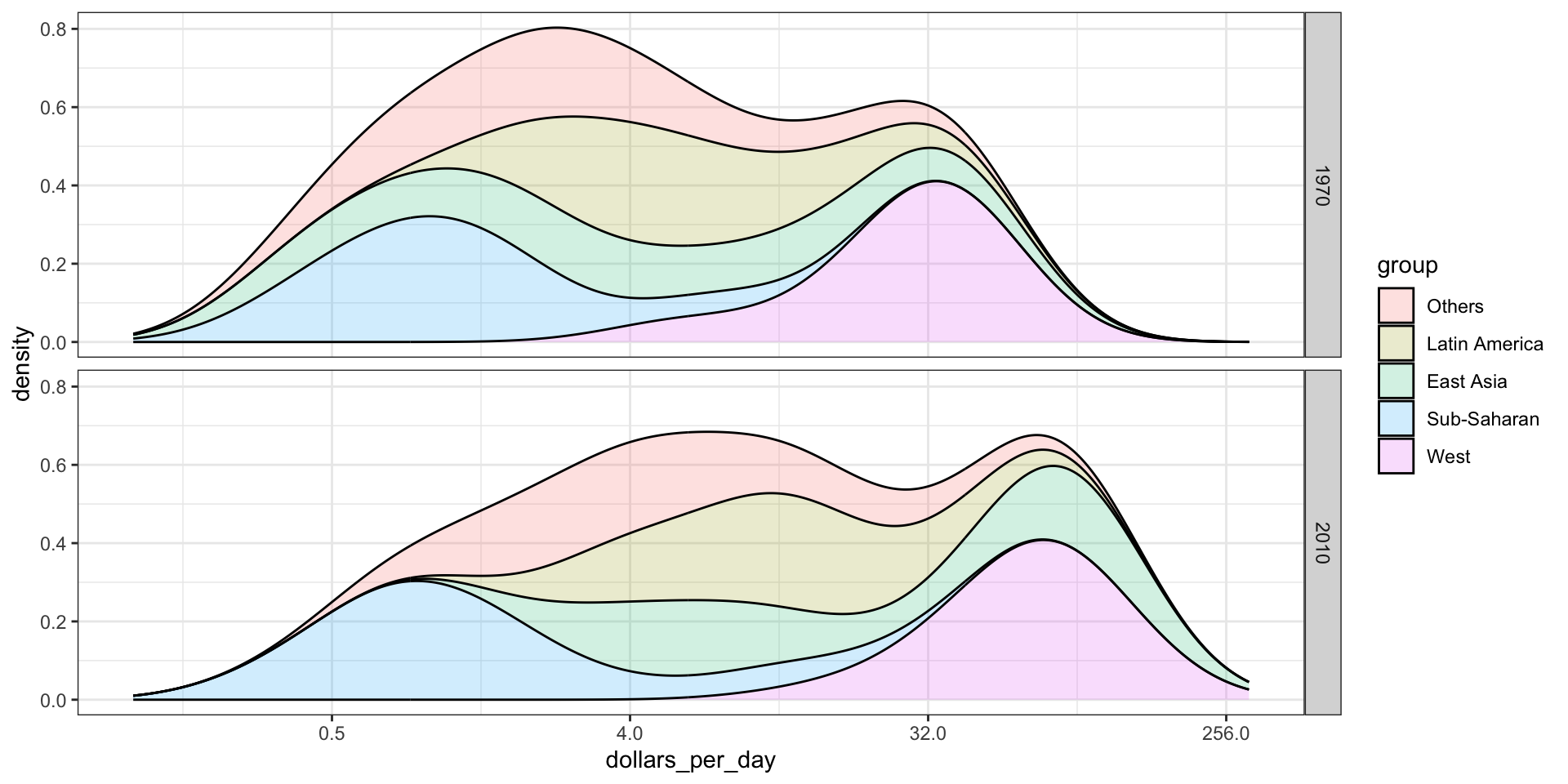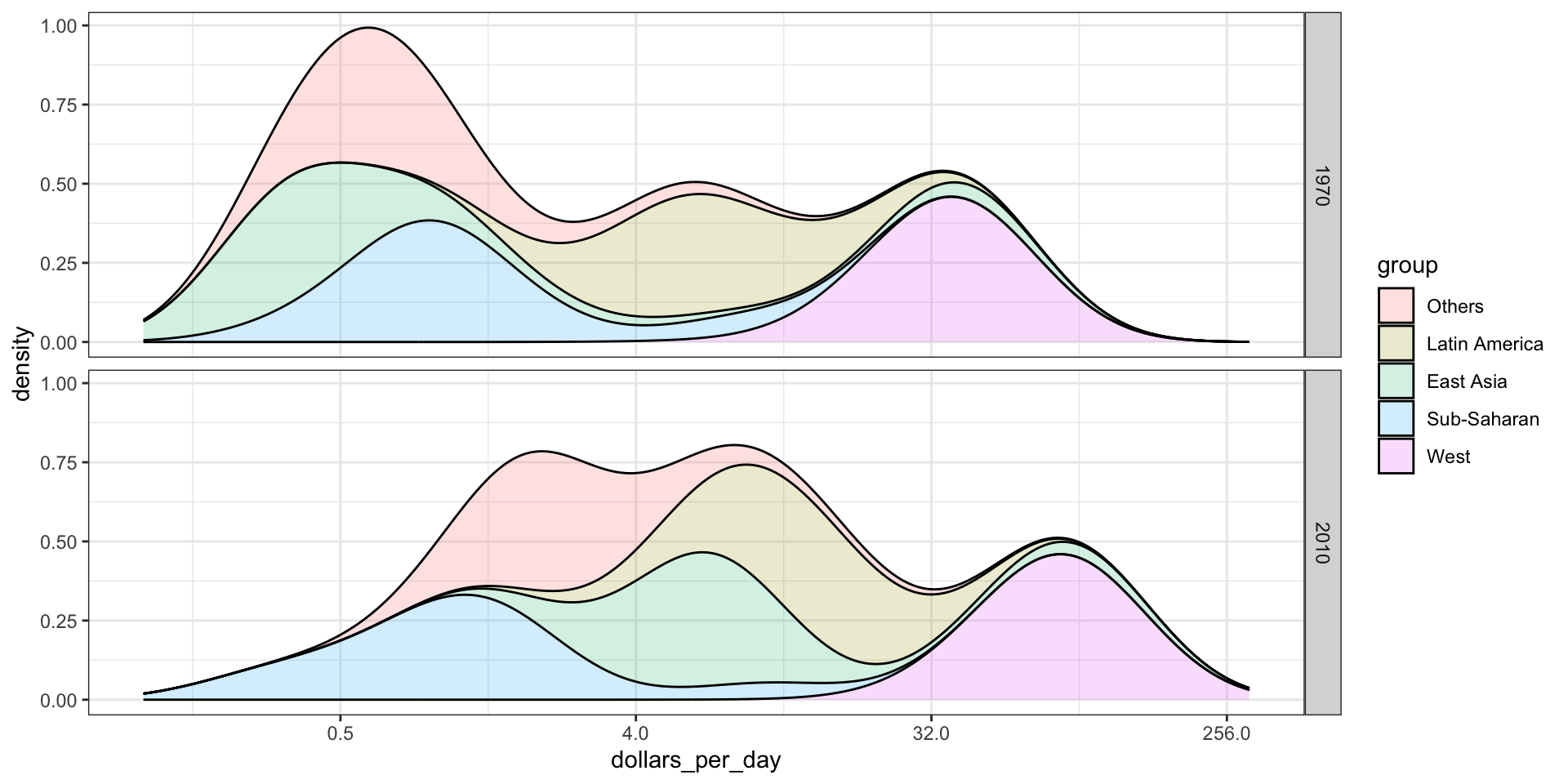 gapminder |>filter(year %in% years & country %in% country_list) |>group_by(year) |>mutate(weight = population/sum(population)*2) |>ungroup() |>ggplot(aes(dollars_per_day, fill = group)) +scale_x_continuous(trans ="log2", limits =c(0.125, 300)) +geom_density(alpha =0.2, bw =0.75, position ="stack") +facet_grid(year ~ .)