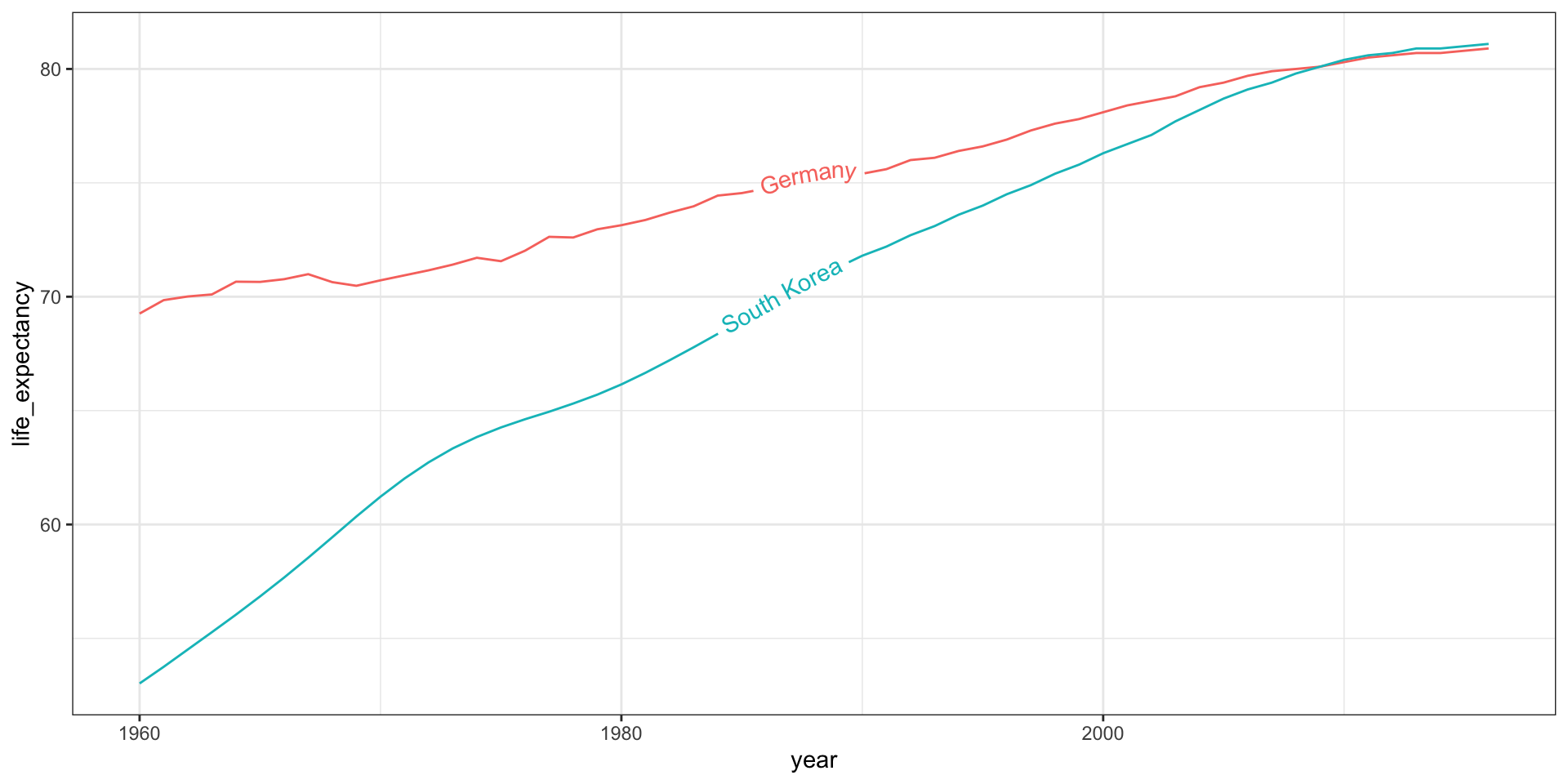 countries <-c("South Korea","Germany") gapminder |>filter(country %in% countries &!is.na(fertility)) |>ggplot(aes(year, fertility, group = country)) +geom_line()