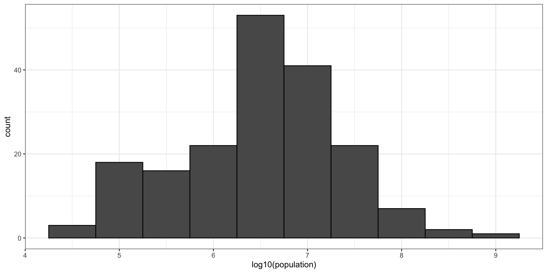 gapminder |>filter(year == past_year) |>ggplot(aes(log10(population))) +geom_histogram(binwidth =0.5, color ="black")