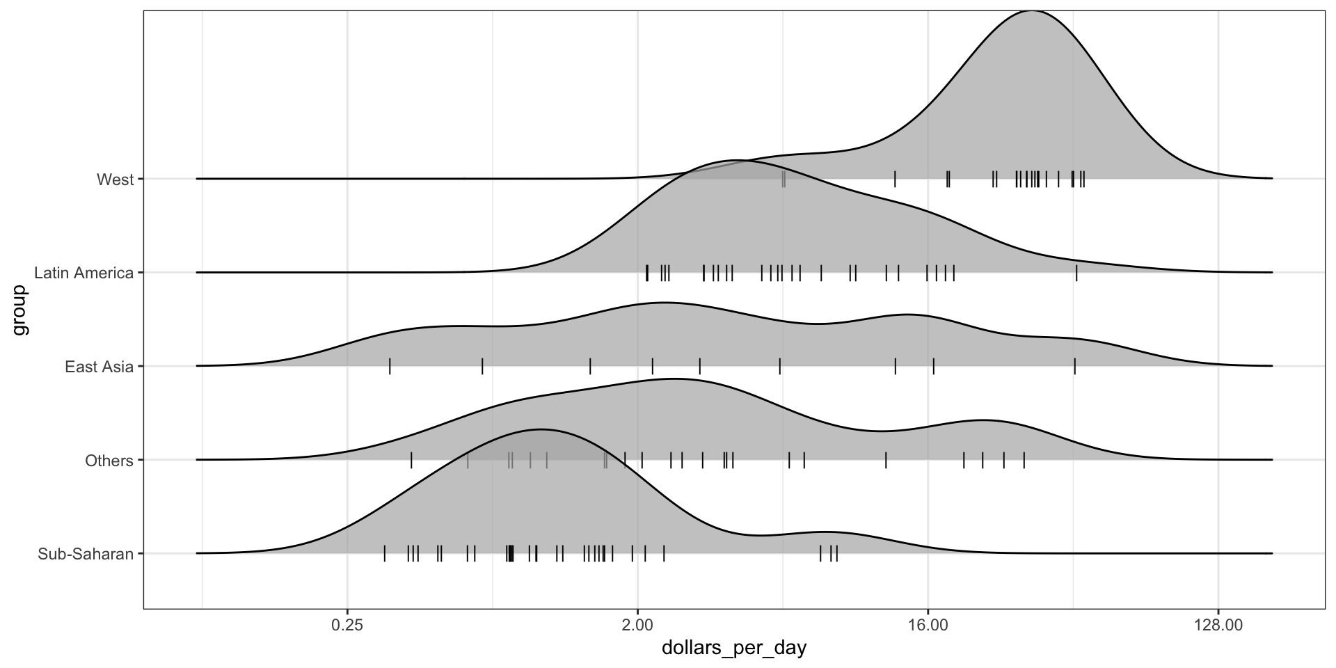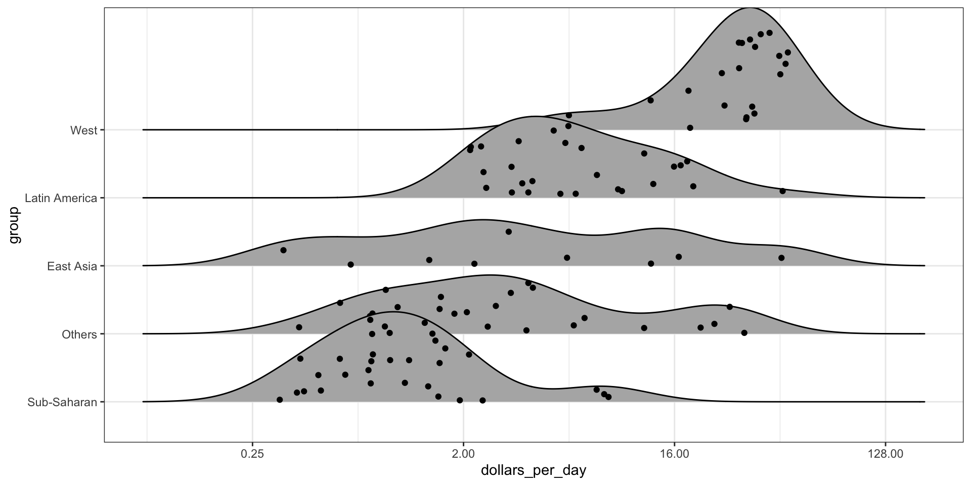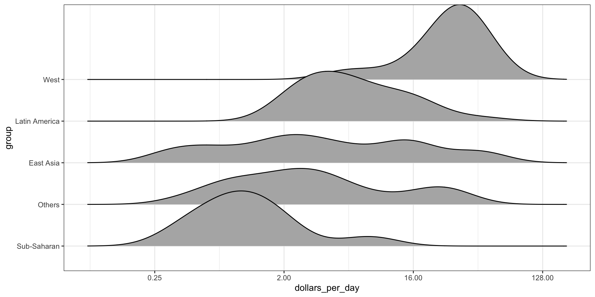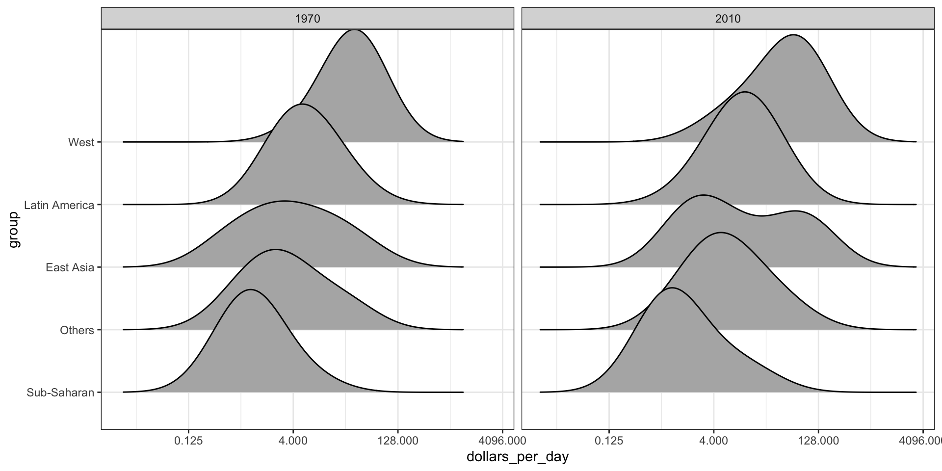 gapminder |>filter(year %in% years &!is.na(dollars_per_day)) |>mutate(group =reorder(group, dollars_per_day, FUN = median)) |>ggplot(aes(dollars_per_day, group)) +scale_x_continuous(trans ="log2") +geom_density_ridges(bandwidth =1.5) +facet_grid(. ~ year)