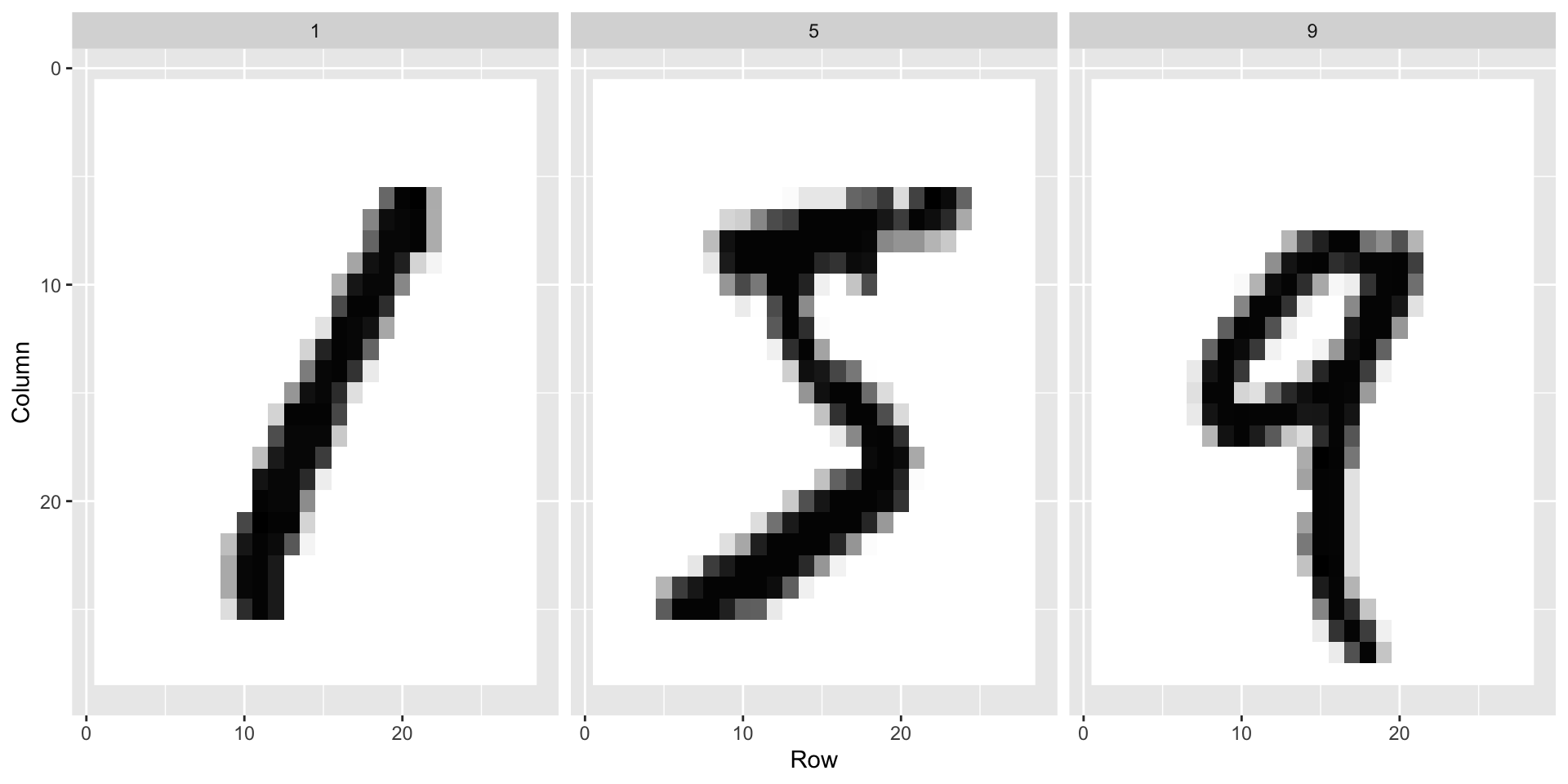 For each digitized image, indexed by \(i\), we are provided with 784 variables and a categorical outcome, or label, representing the digit among \(0, 1, 2, 3, 4, 5, 6, 7 , 8,\) and \(9\) that the image is representing.