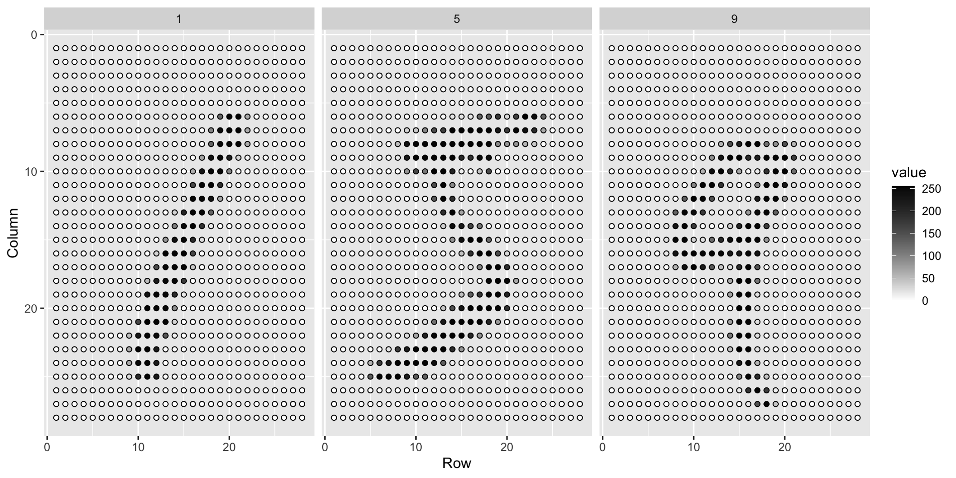 The third row of the matrix x[3,] contains the 784 pixel intensities.