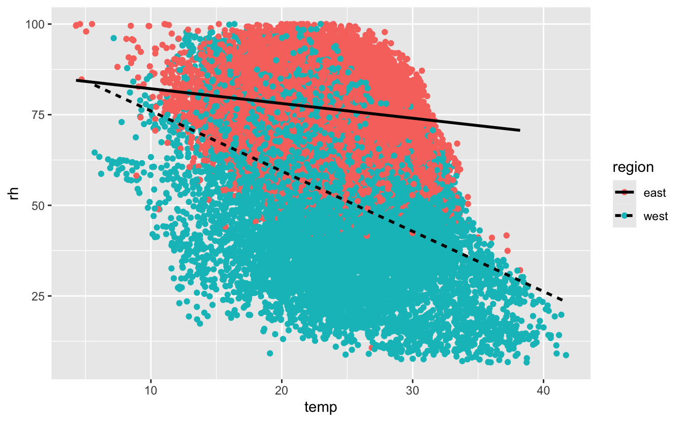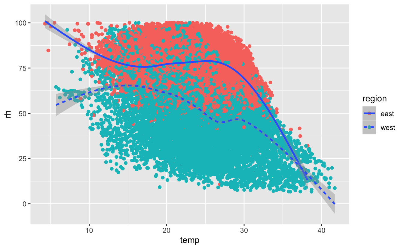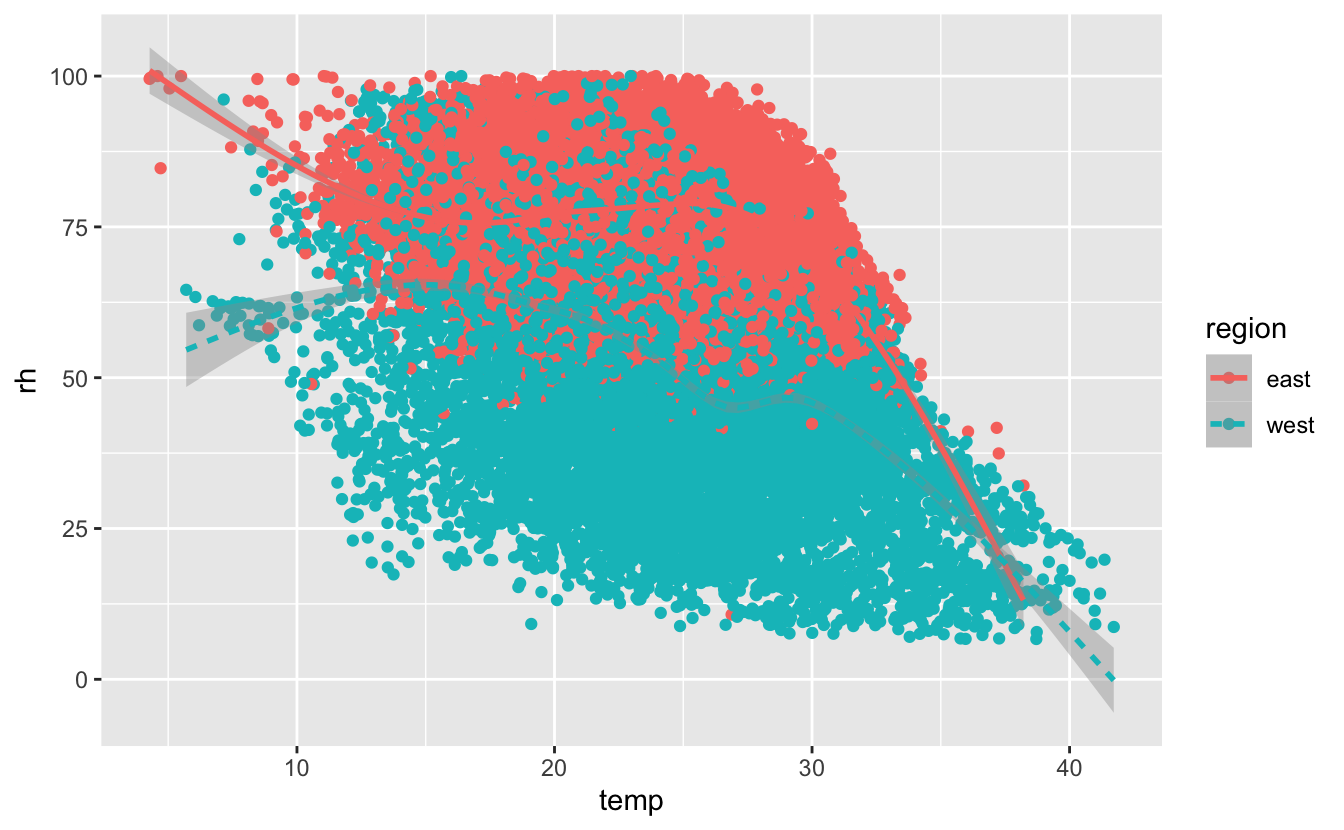 Here we make the line type depend on the region and we clearly see east has higher rh than west, but generally as temperatures increase rh decreases in both regions.