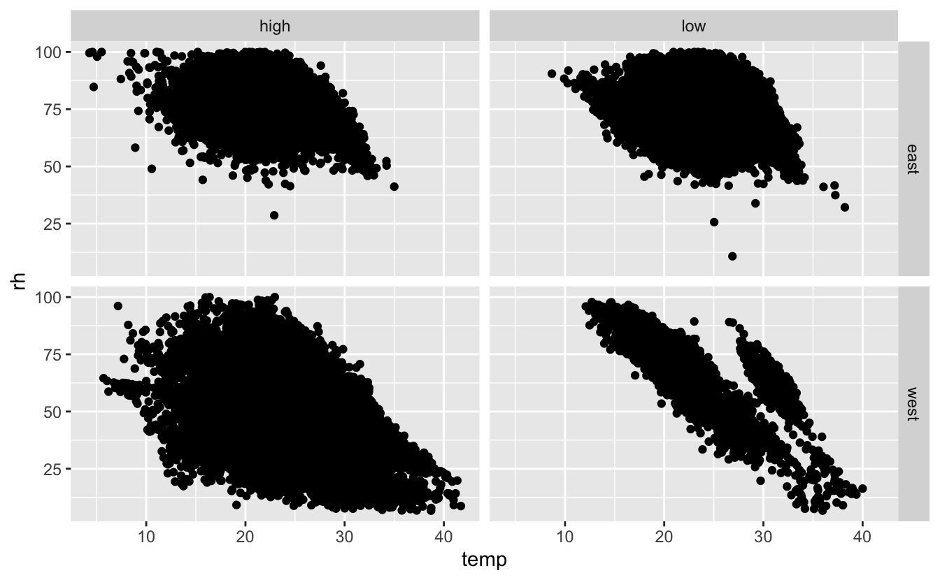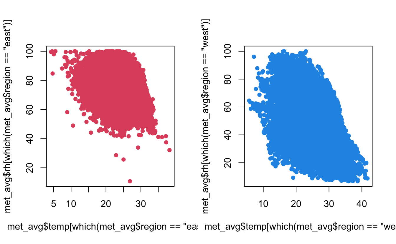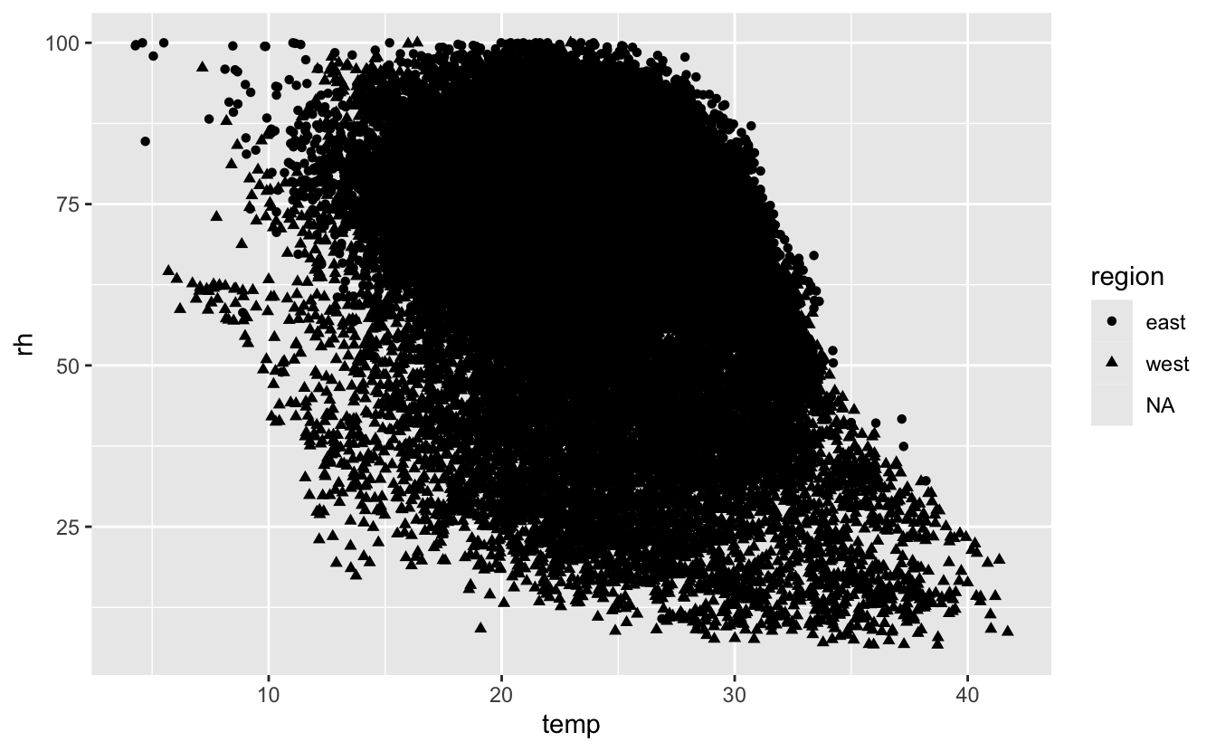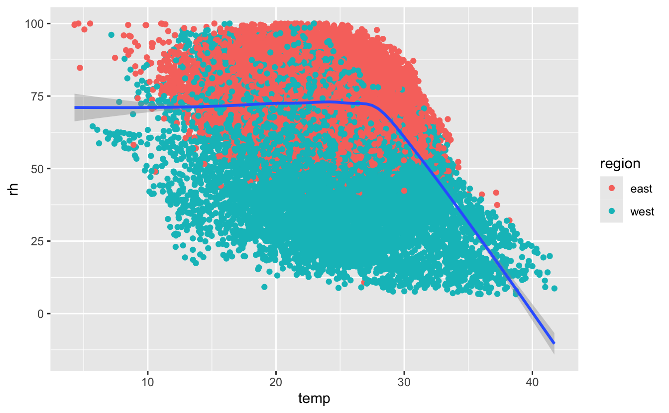 Here we make the line type depend on the region and we clearly see east has higher rh than west, but generally as temperatures increase rh decreases in both regions.