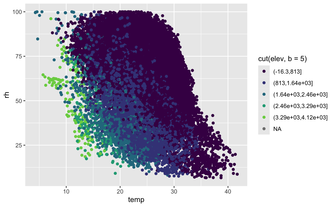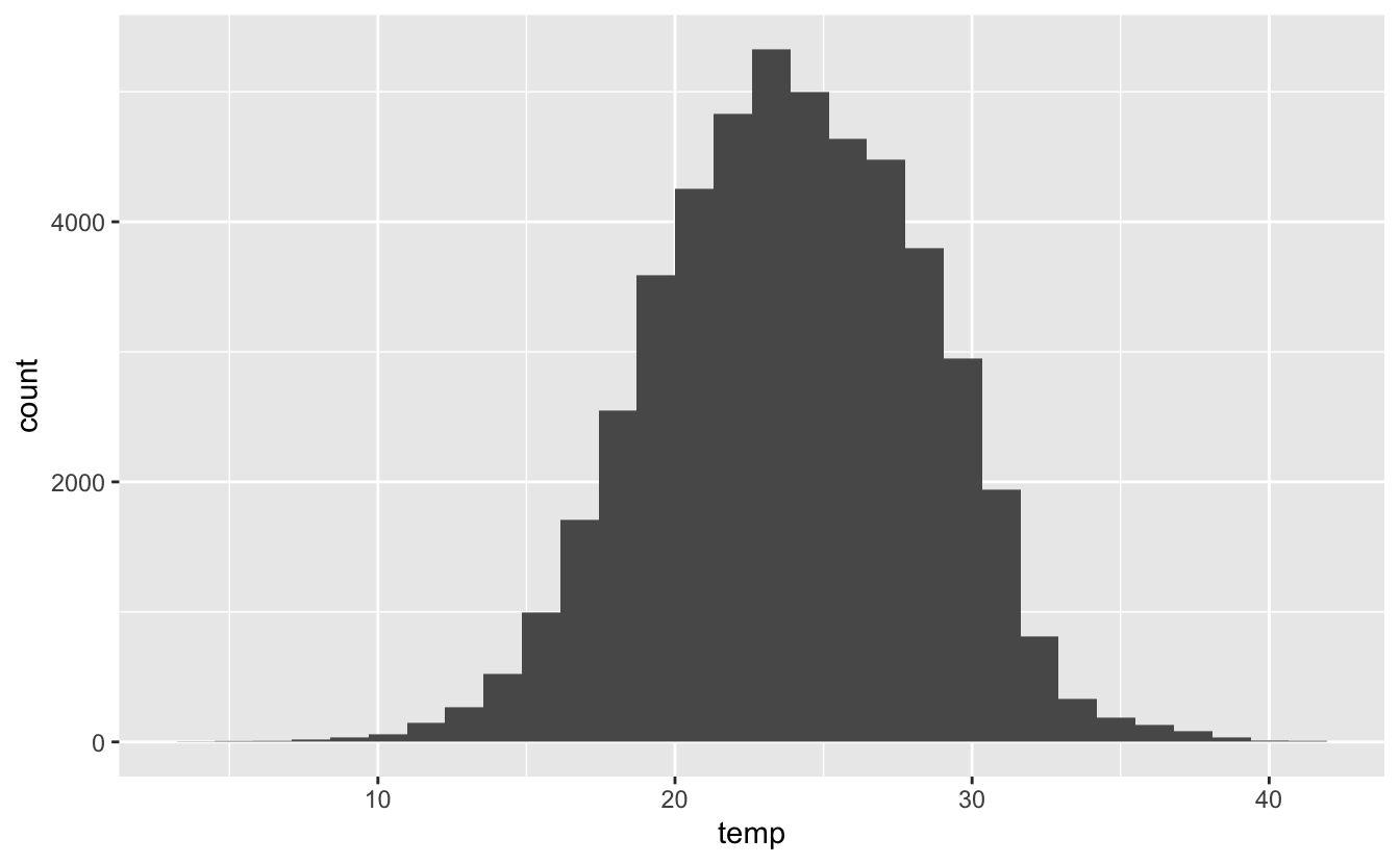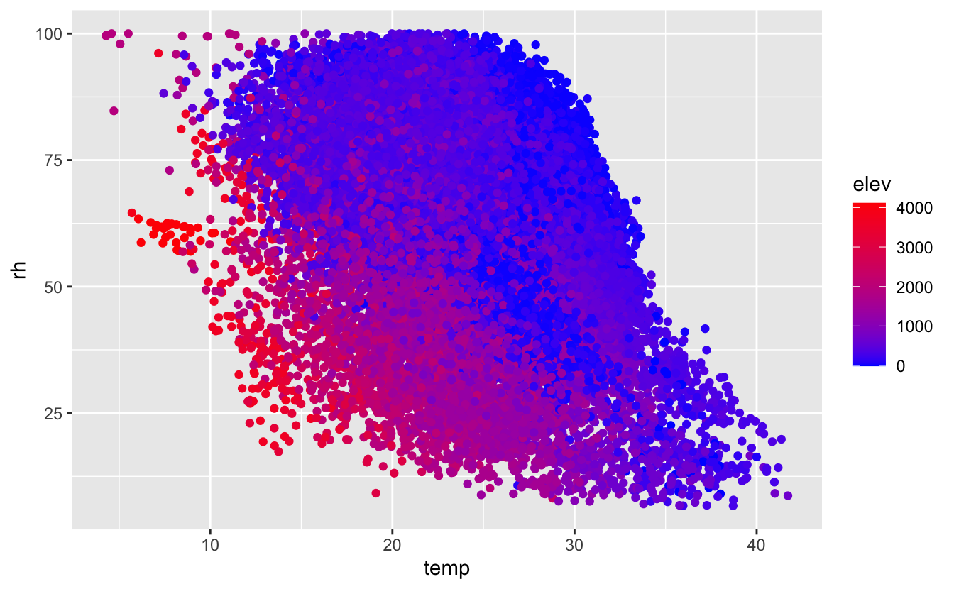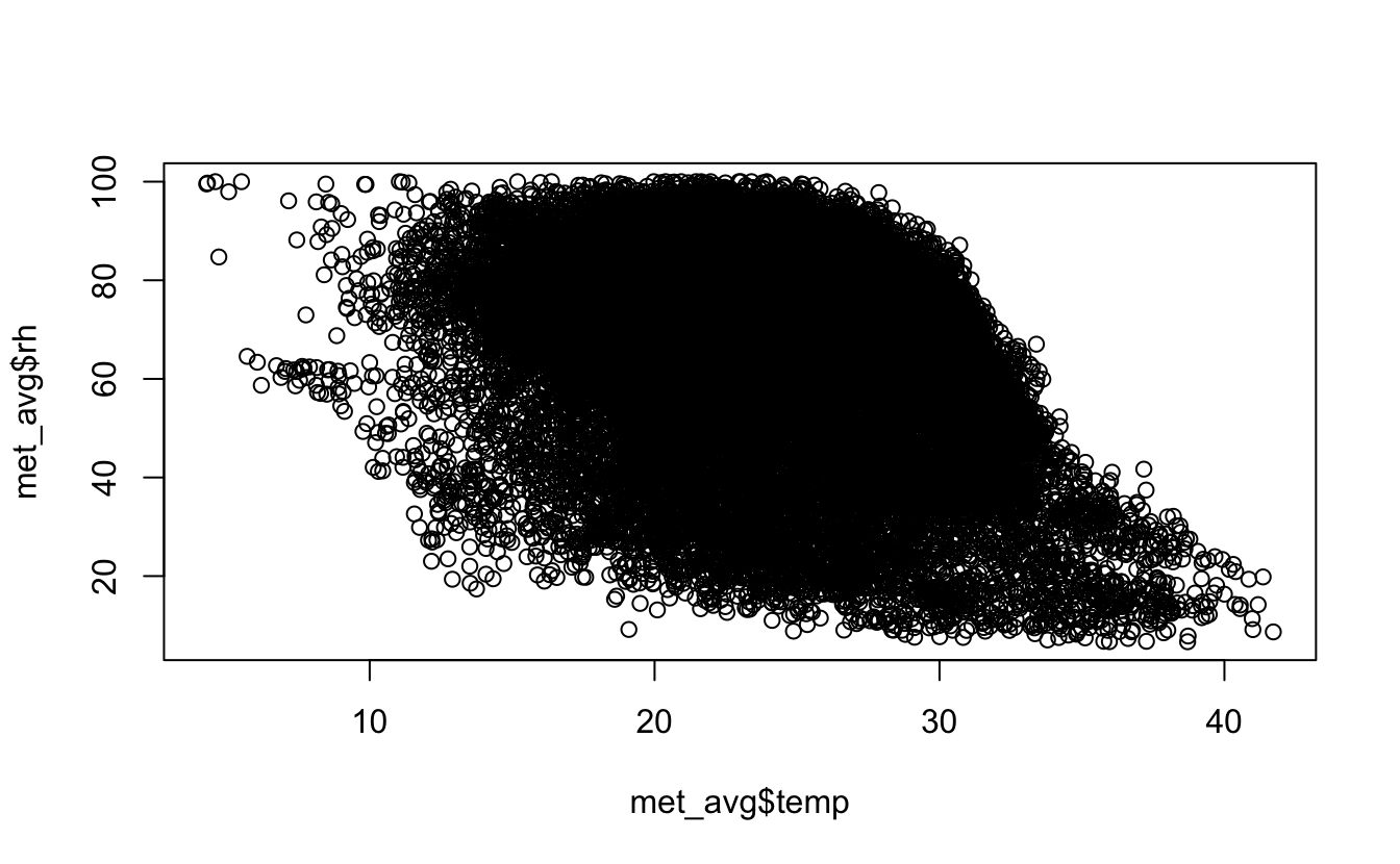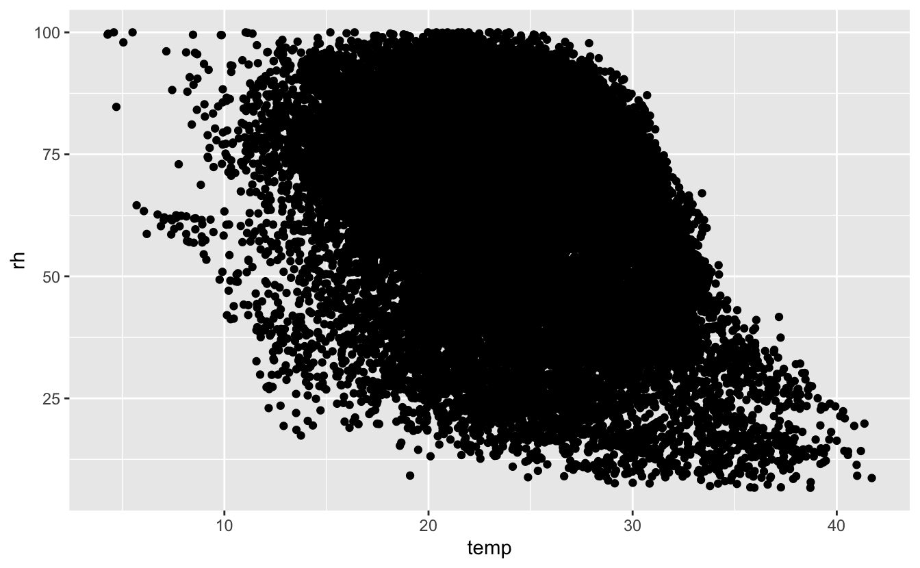 right = FALSE)The variables we will focus on for this example are temp and rh (temperature in C and relative humidity %)