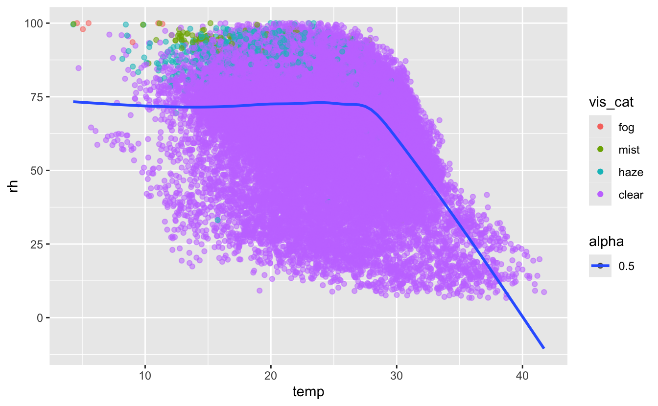 You can use the same idea to specify different data for each layer. Here, our smooth line displays the full met dataset but the points are colored by visibilty.