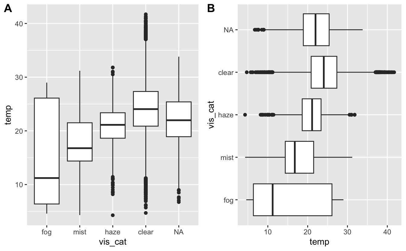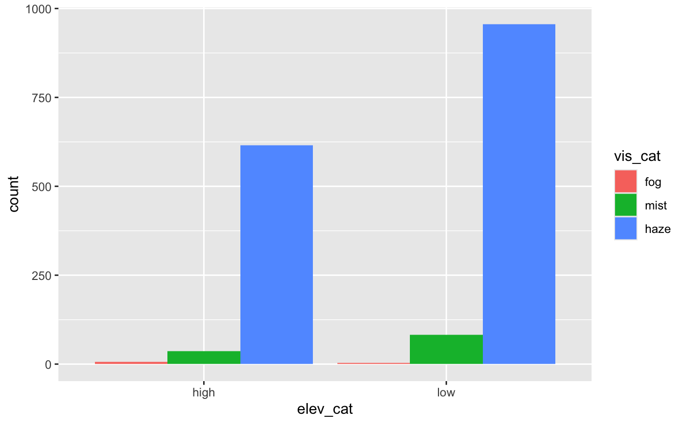 ggplot()ggplot() is the dataset to use in the graphggplot() with +geom functions such as point, lines, etcgeom function takes a mapping argument, which is always paired with aes()aes() mapping takes the x and y axes of the plotContinuing with the weather data from last week, let’s take the daily averages at each site, keeping some of the variables. Let’s also create a new variable for region (east and west), categorize elevation, and create a multi-category variable for visibility for exploratory purposes.