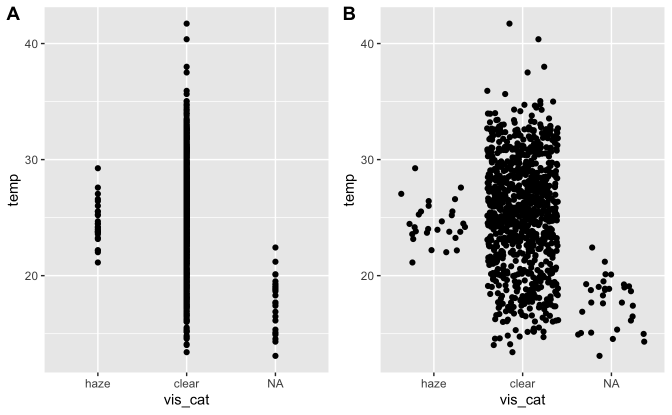 An option that can be very useful is position = "jitter". This adds a small amount of random noise to each point. This spreads out points that might otherwise be overlapping.