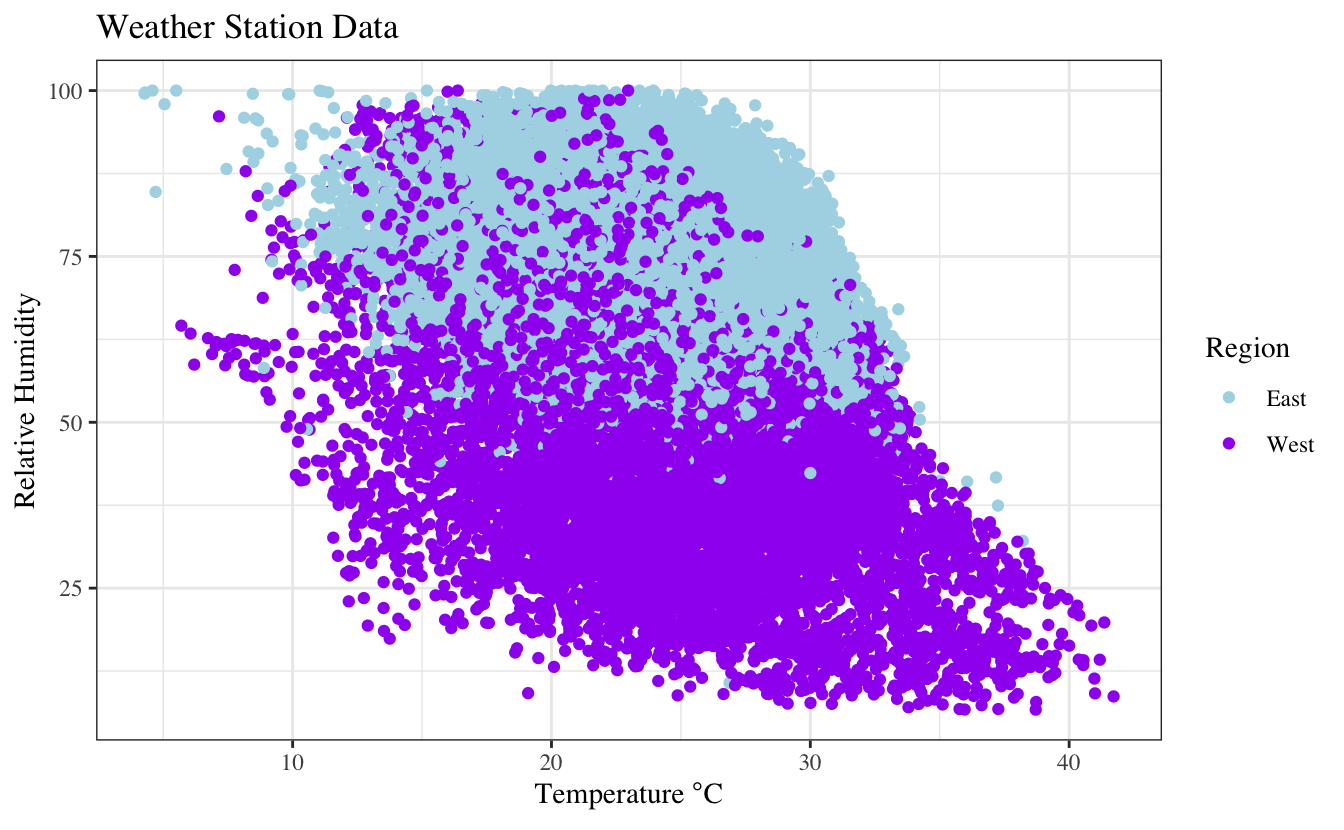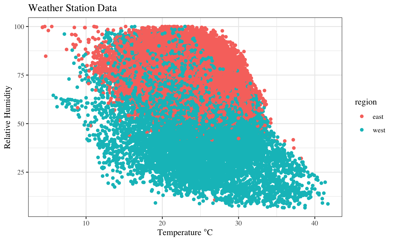 labs(title = "Weather Station Data",x = expression("Temperature"*~degree*C), y = "Relative Humidity")+